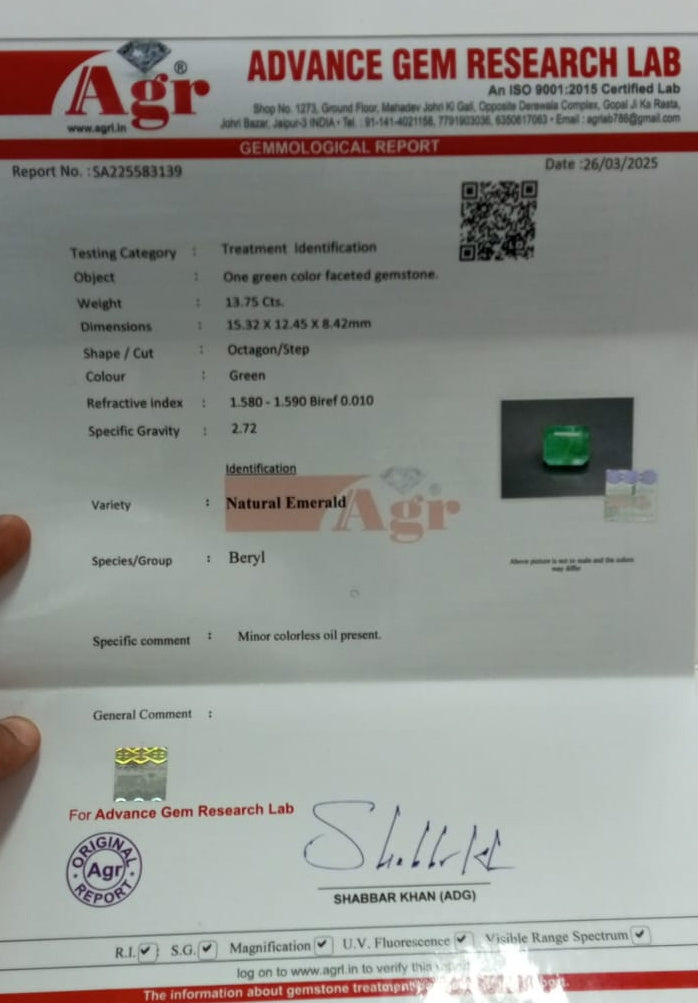 To guarantee your investment, this exquisite emerald comes with a certificate (AGRL SA225583139) that verifies its authenticity and quality. This certification not only adds value but also provides peace of mind, knowing that you are acquiring a genuine natural gemstone.