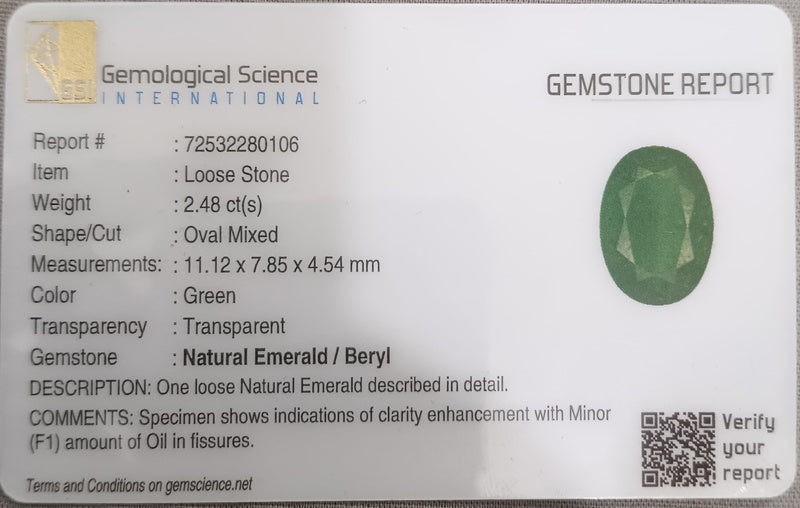 2.48ct Certified Zambian Emerald Natural Medium Deep Velvet Green Oval Cut Loose Gemstone