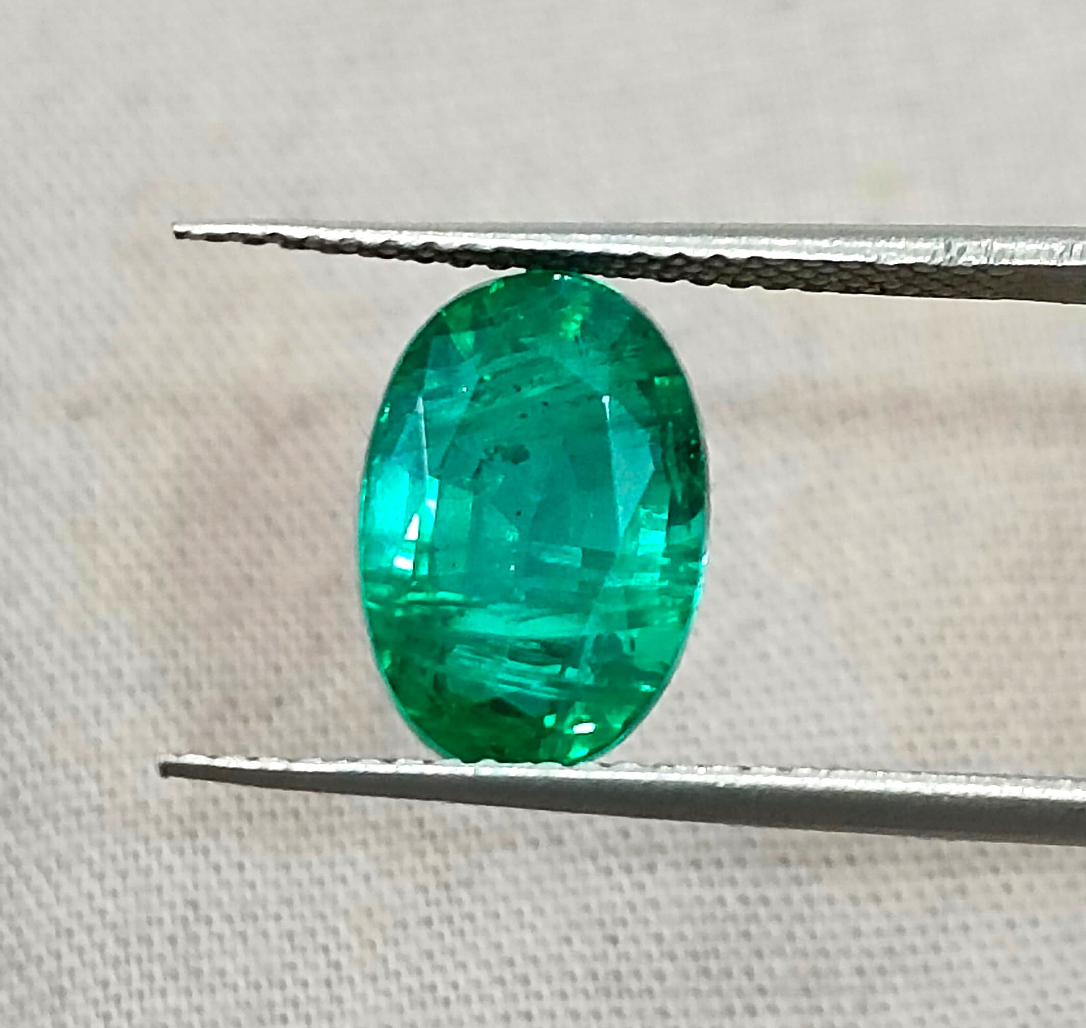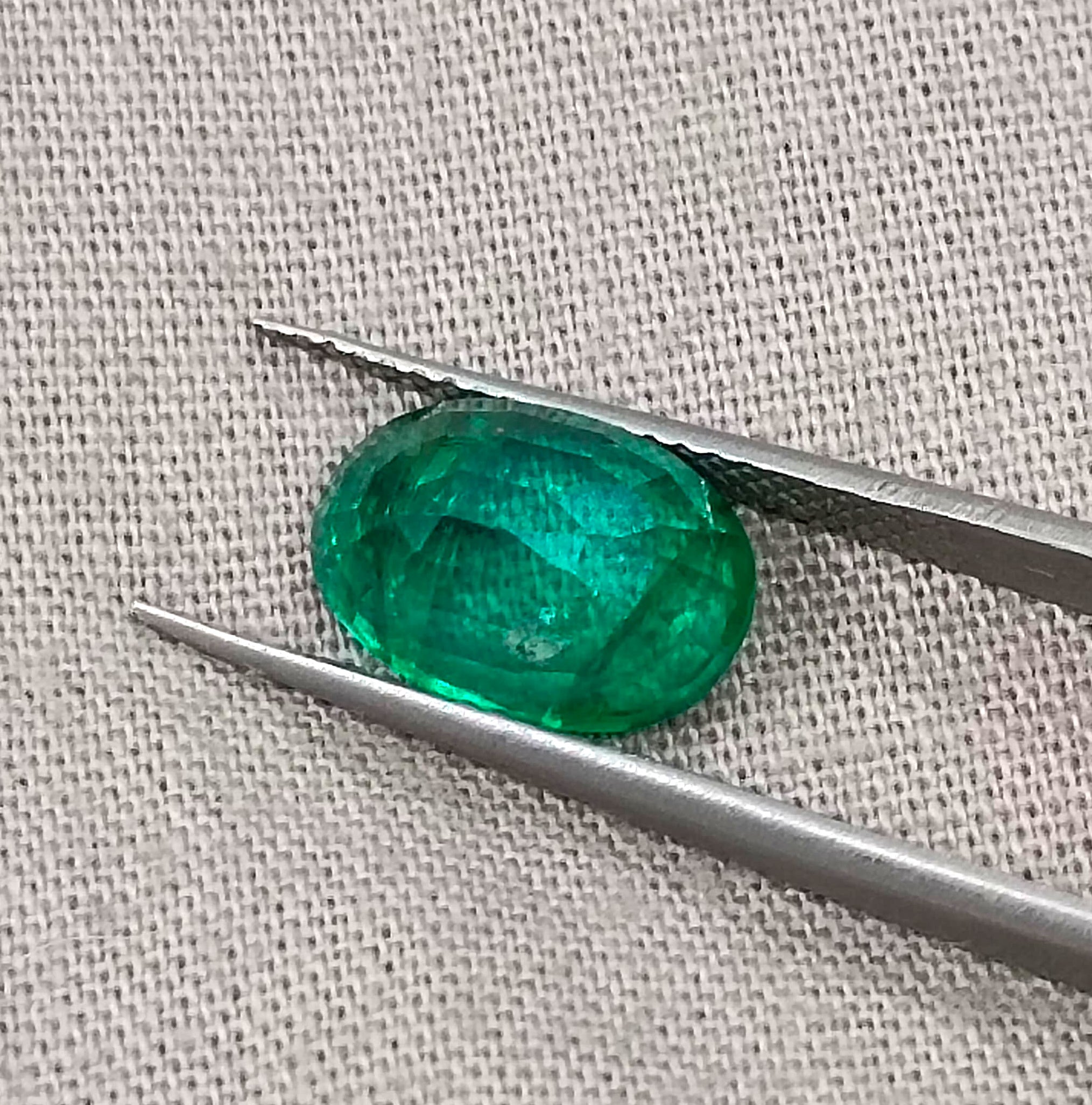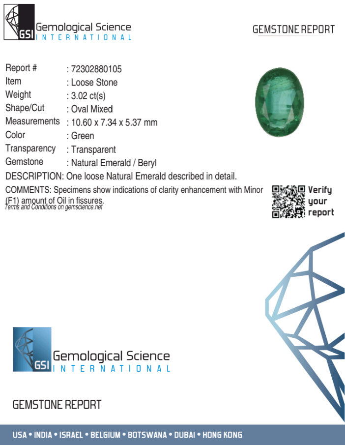 3.02 carats GSI certified vivid green Zambian emerald. Minor oiled loose gemstone. Color: Deep Vivid green Cut - Oval cut...