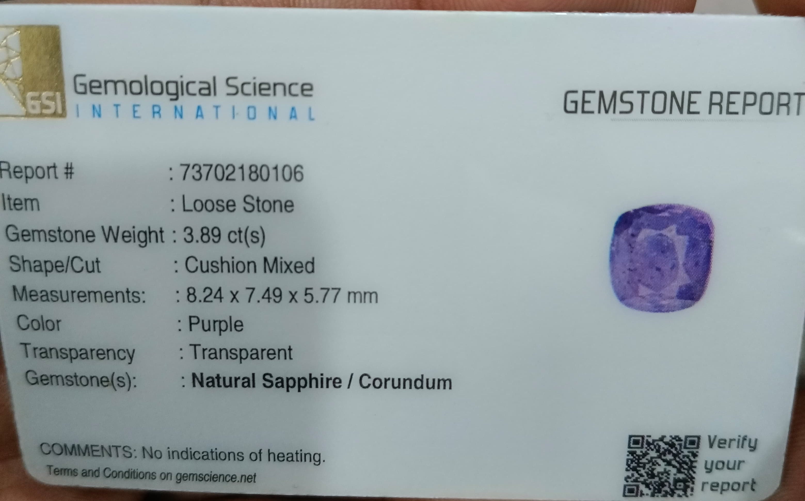 3.89ct Natural untreated loose purple sapphire. Color: PurpleColor grade: AAClarity: Transparent / Slightly included/ Type IICut: Cushion Cut Certificate: GSI...
