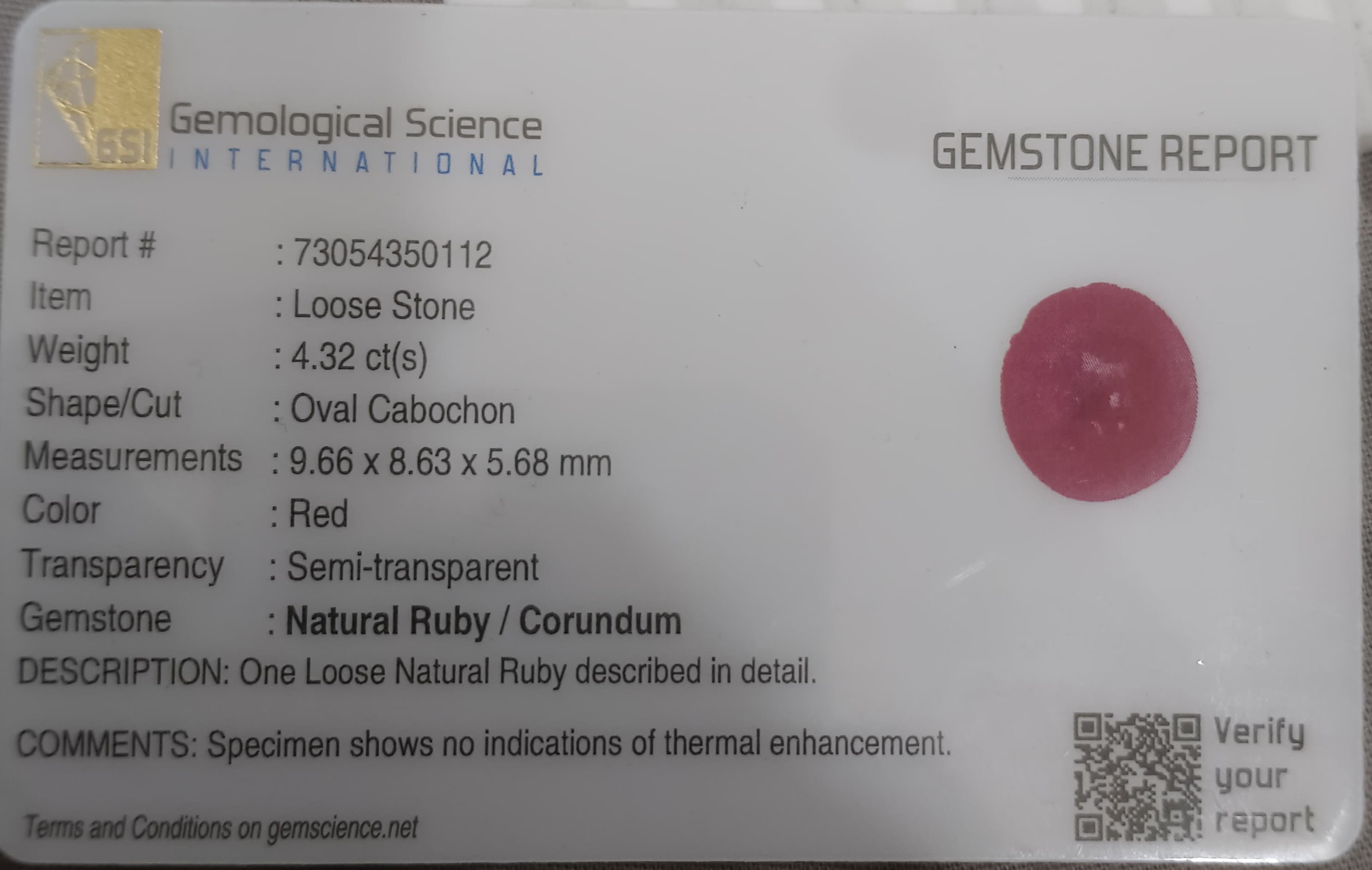 4.32ct Cabochon Cut Certified Natural Red African Ruby Unheated Gemstone