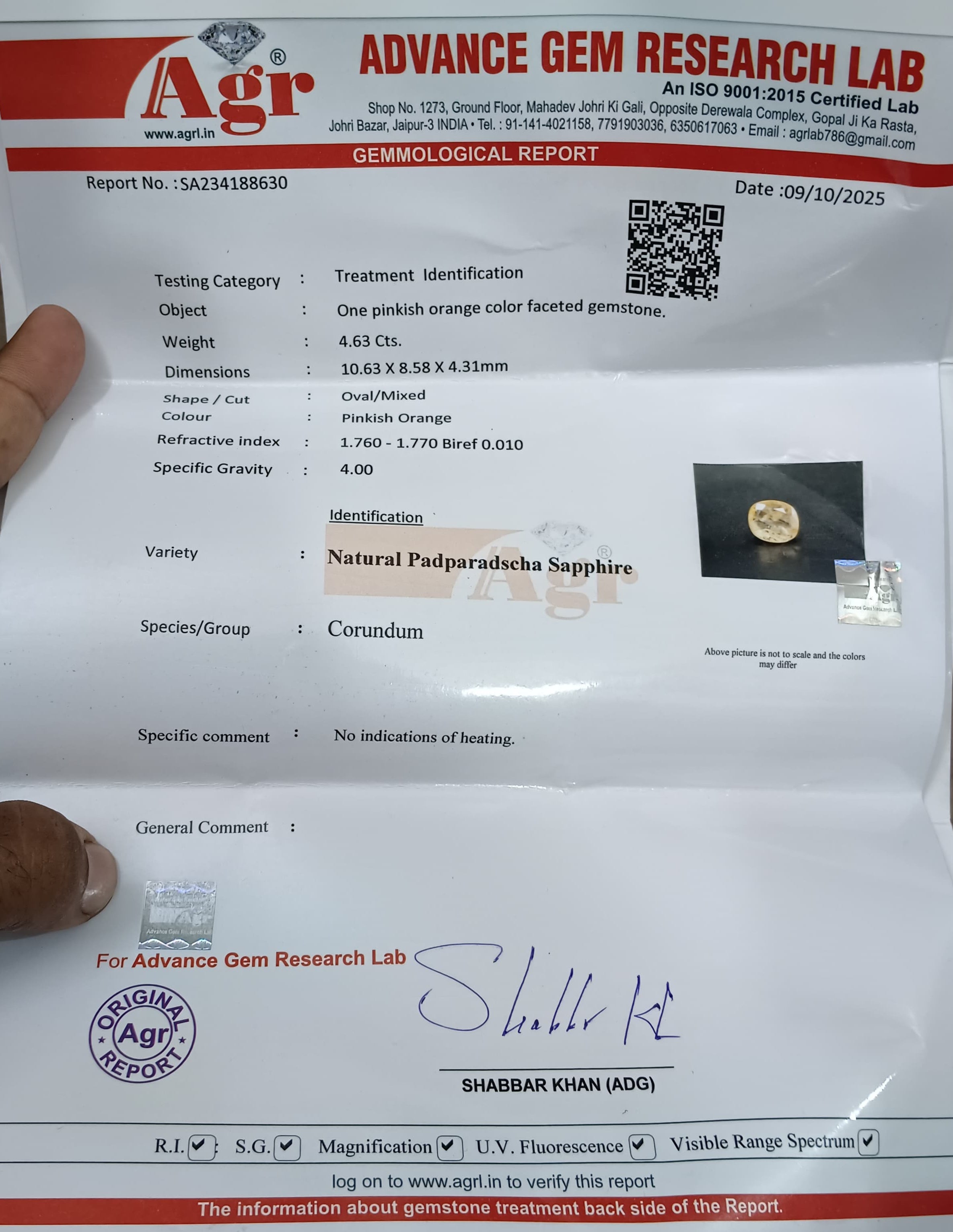 4.63ct Natural untreated Padparadscha sapphire. AGRL certified loose sapphire. Color: Pinkish OrangeColor grade: AAClarity: Transparent / Moderately included/ Type IICut:...