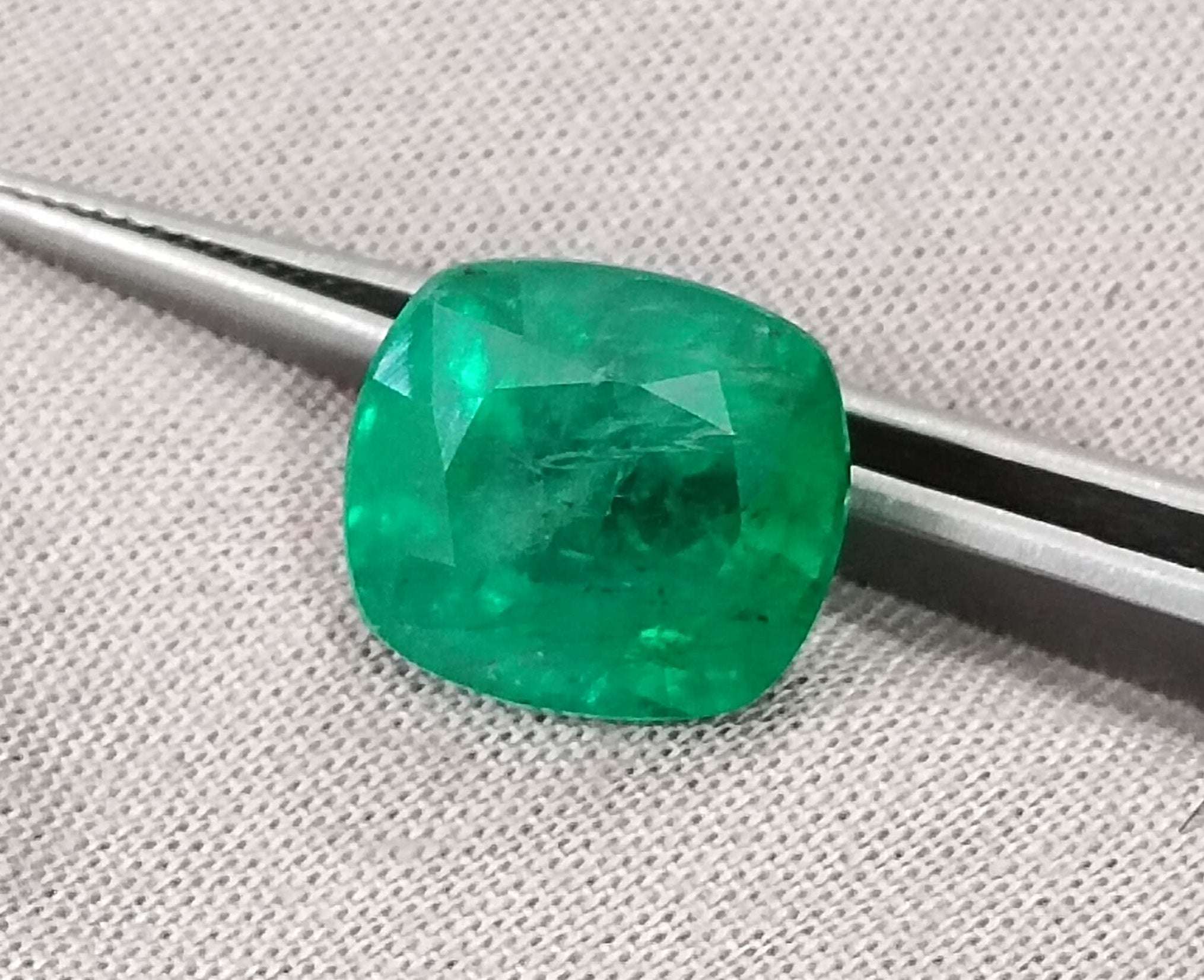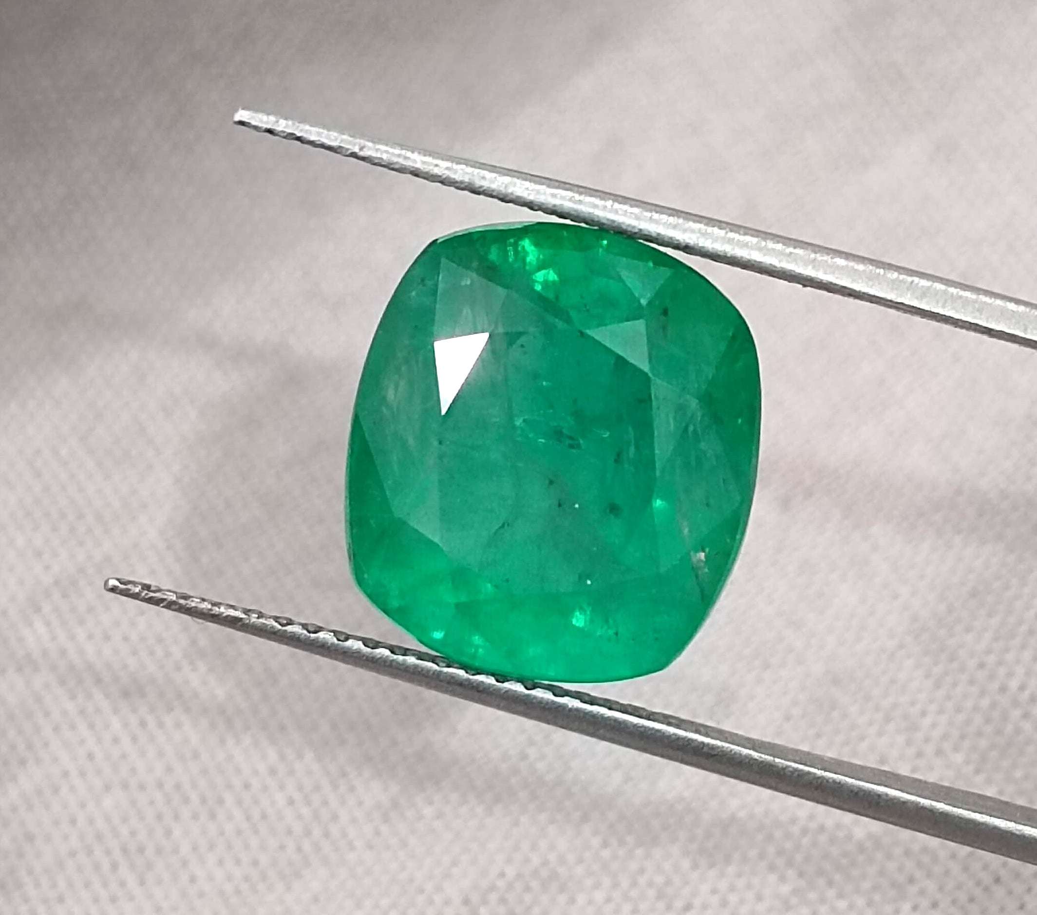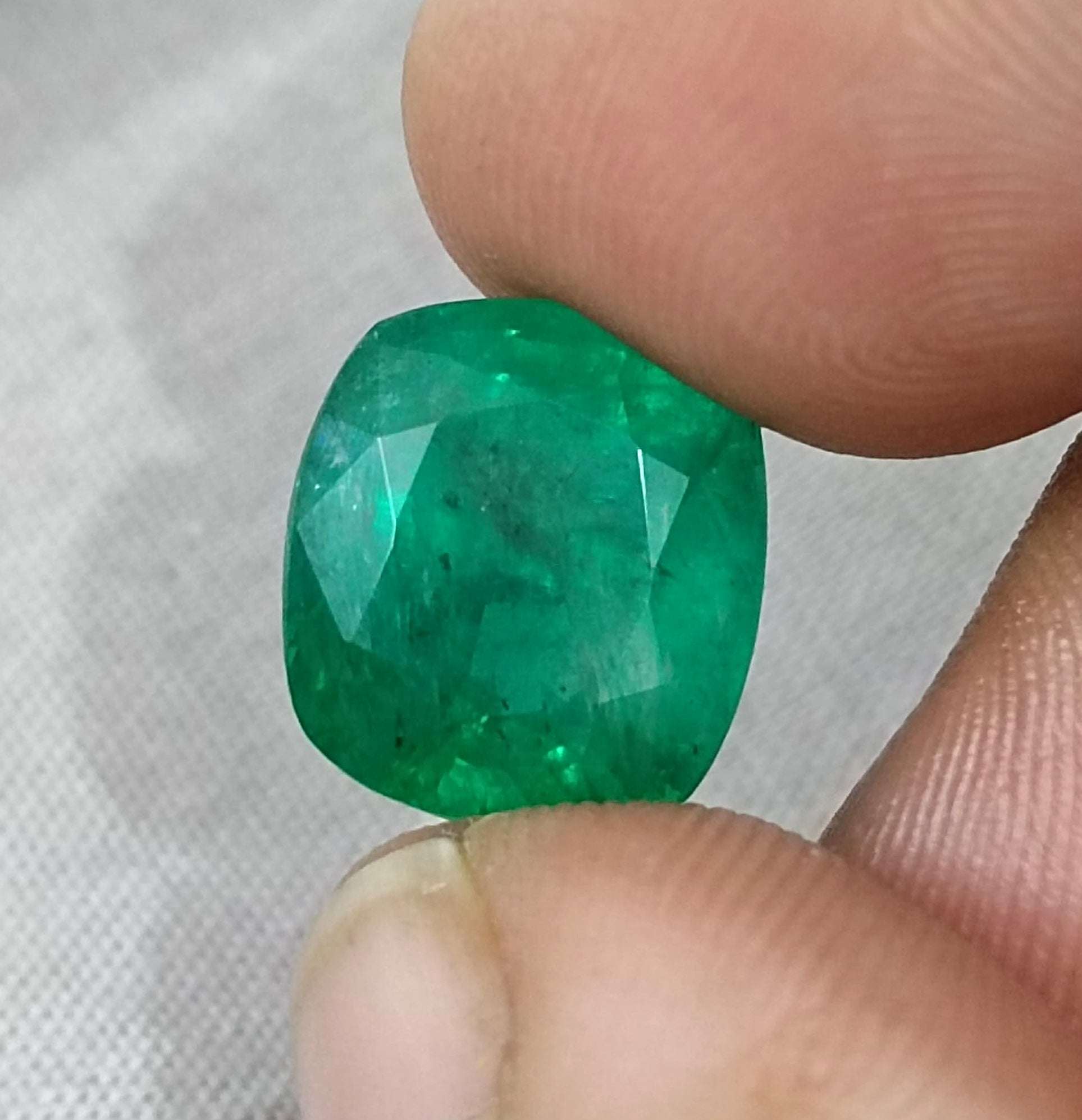 7.30ct Swat Emerald, Medium Bright Green Cushion cut Minor Oiled Natural Loose Gemstone.