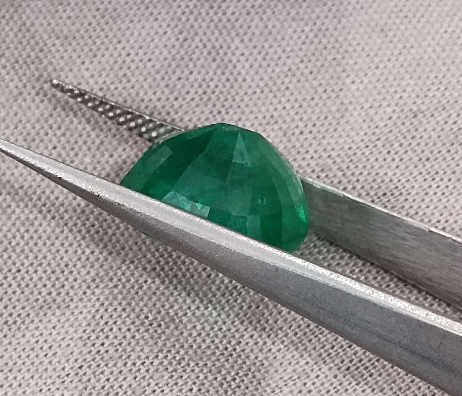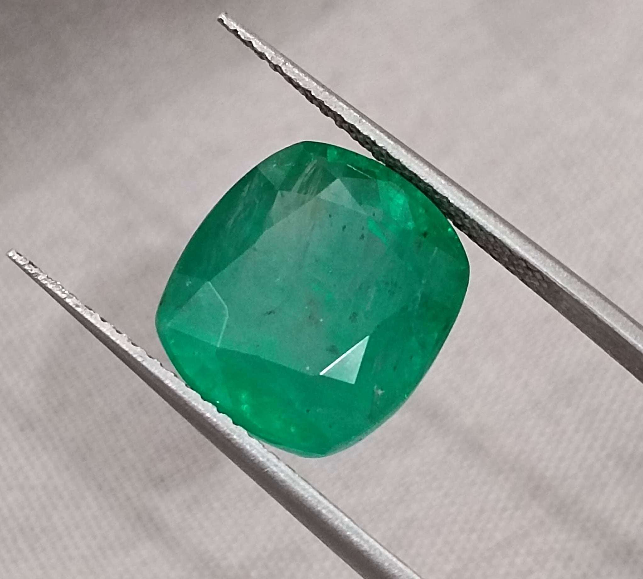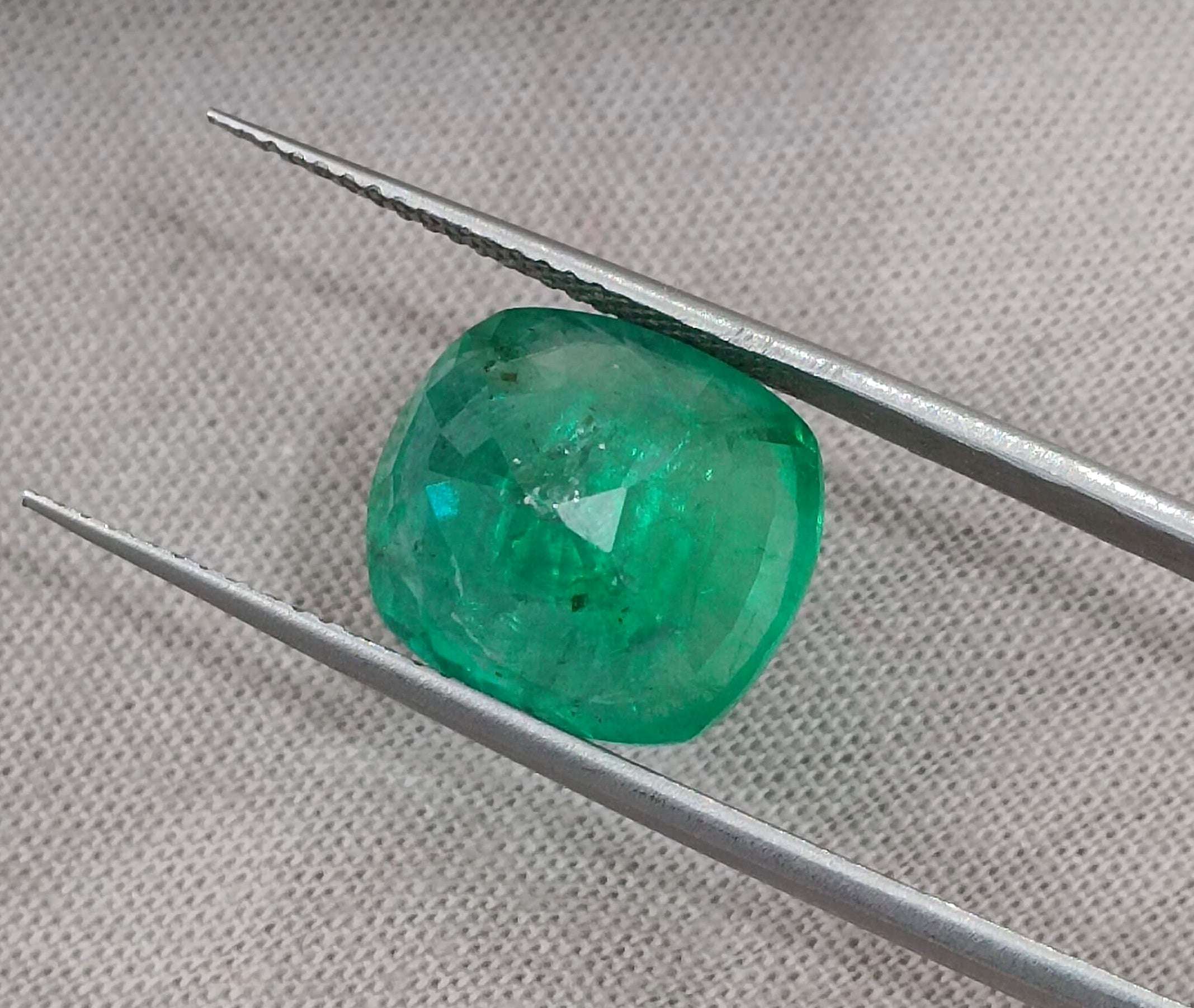 7.30ct Swat Emerald, Medium Bright Green Cushion cut Minor Oiled Natural Loose Gemstone.