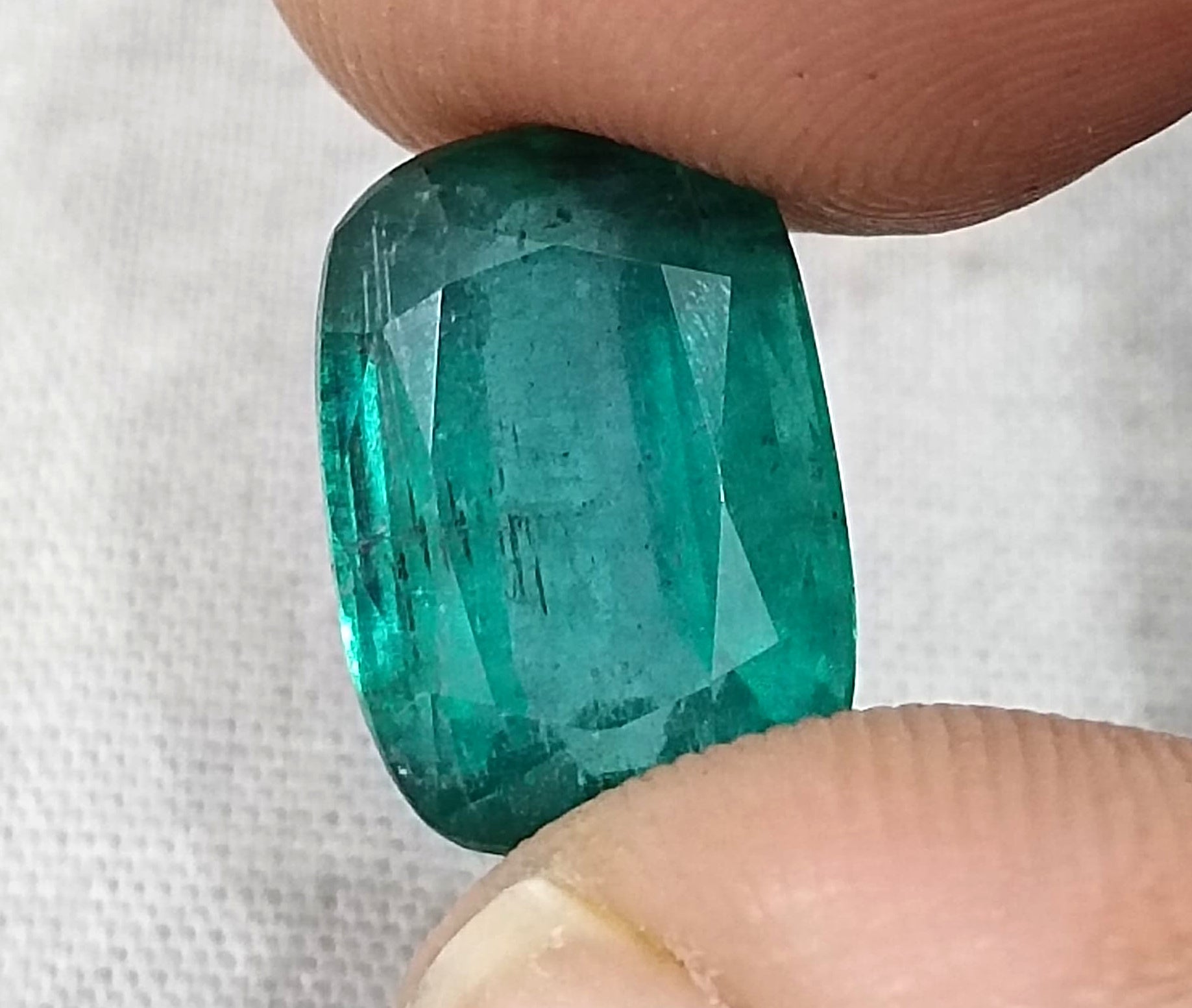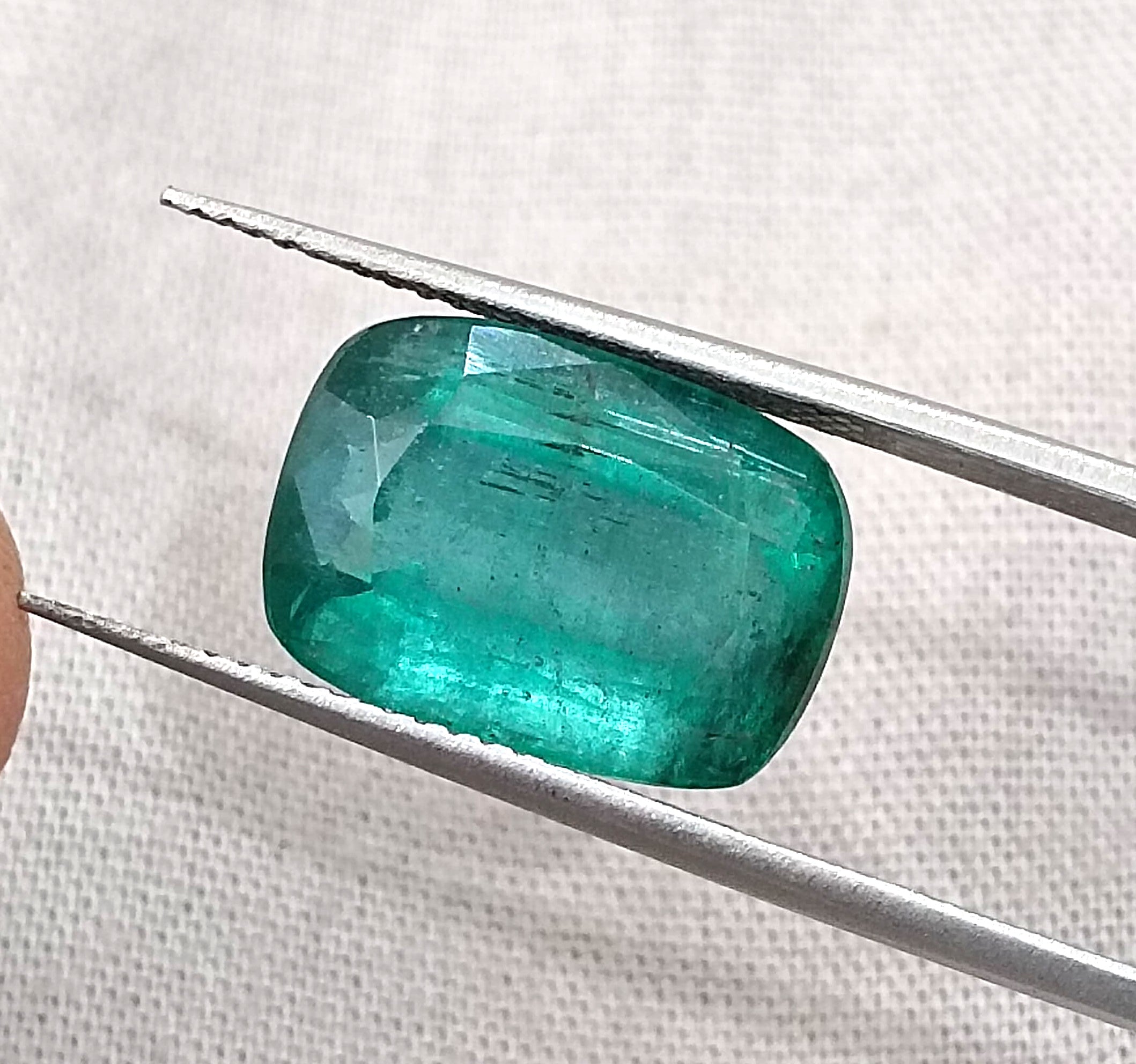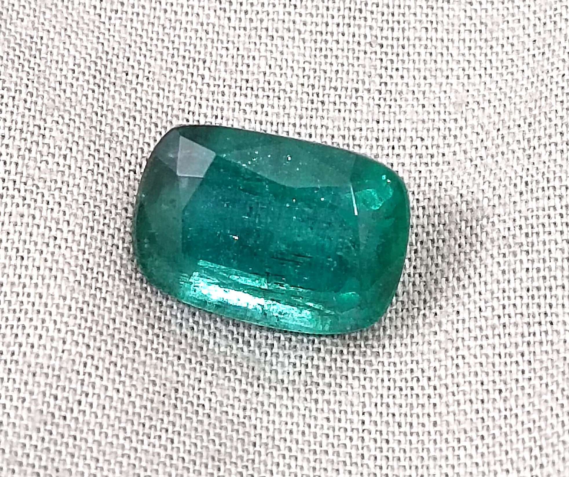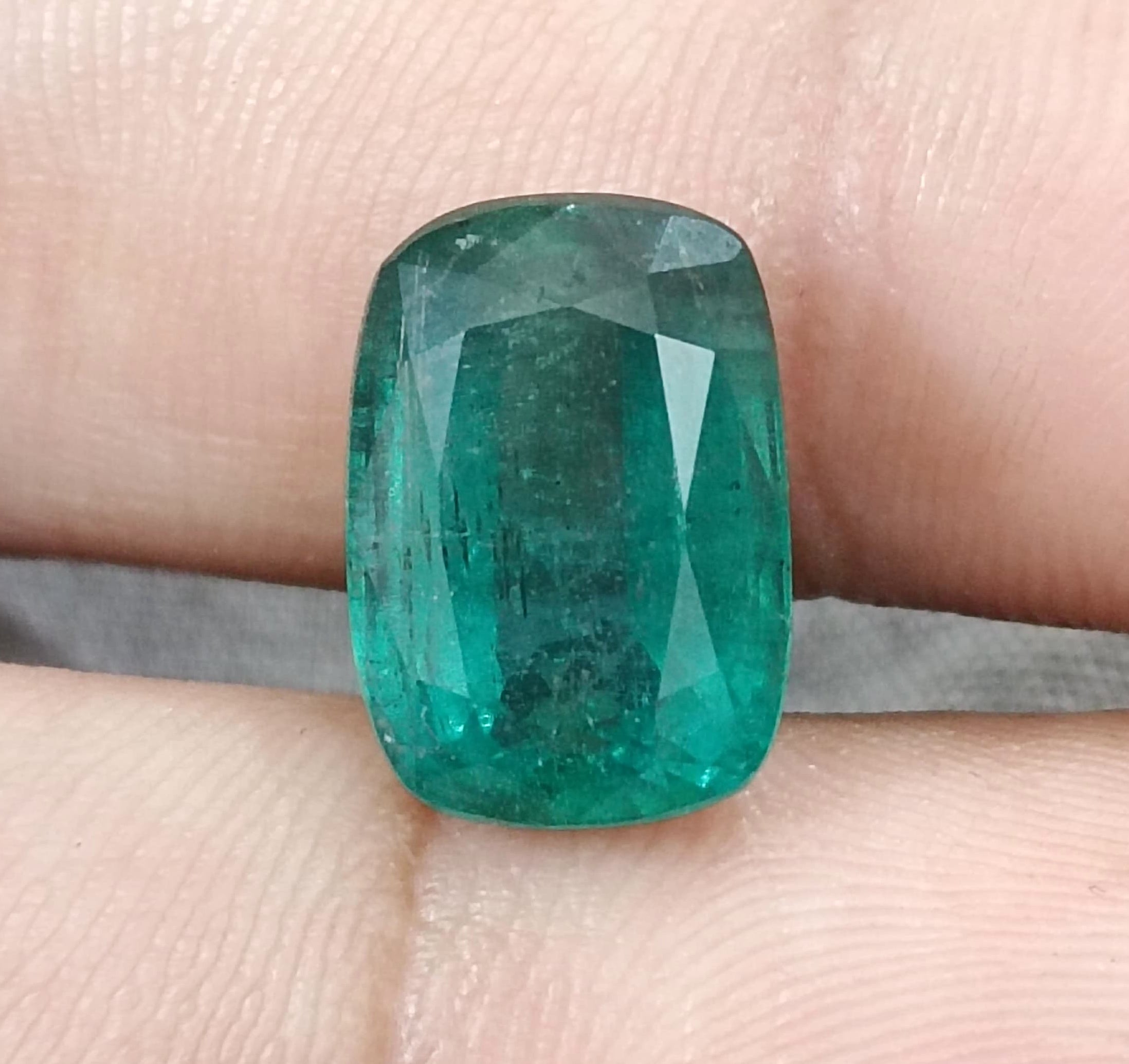 7.34carats deep slightly bluish green Zambian emerald. Minor oiled loose gemstone. Color: deep slightly bluish green Cut - Cushion cut...