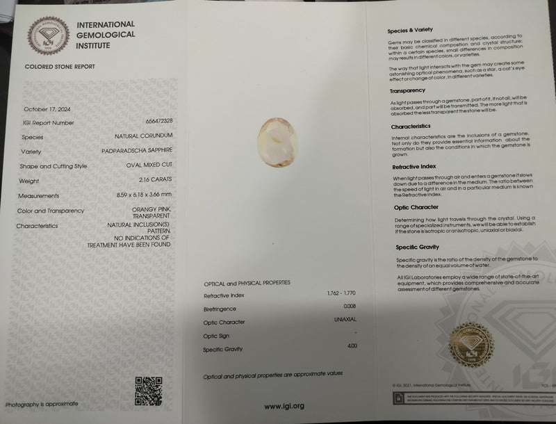 2.16ct IGI Certified natural untreated Padparadscha Sapphire. Color: Orangy PinkClarity: Transparent / Very Slightly included/ Type IICut: Oval ( Egg...