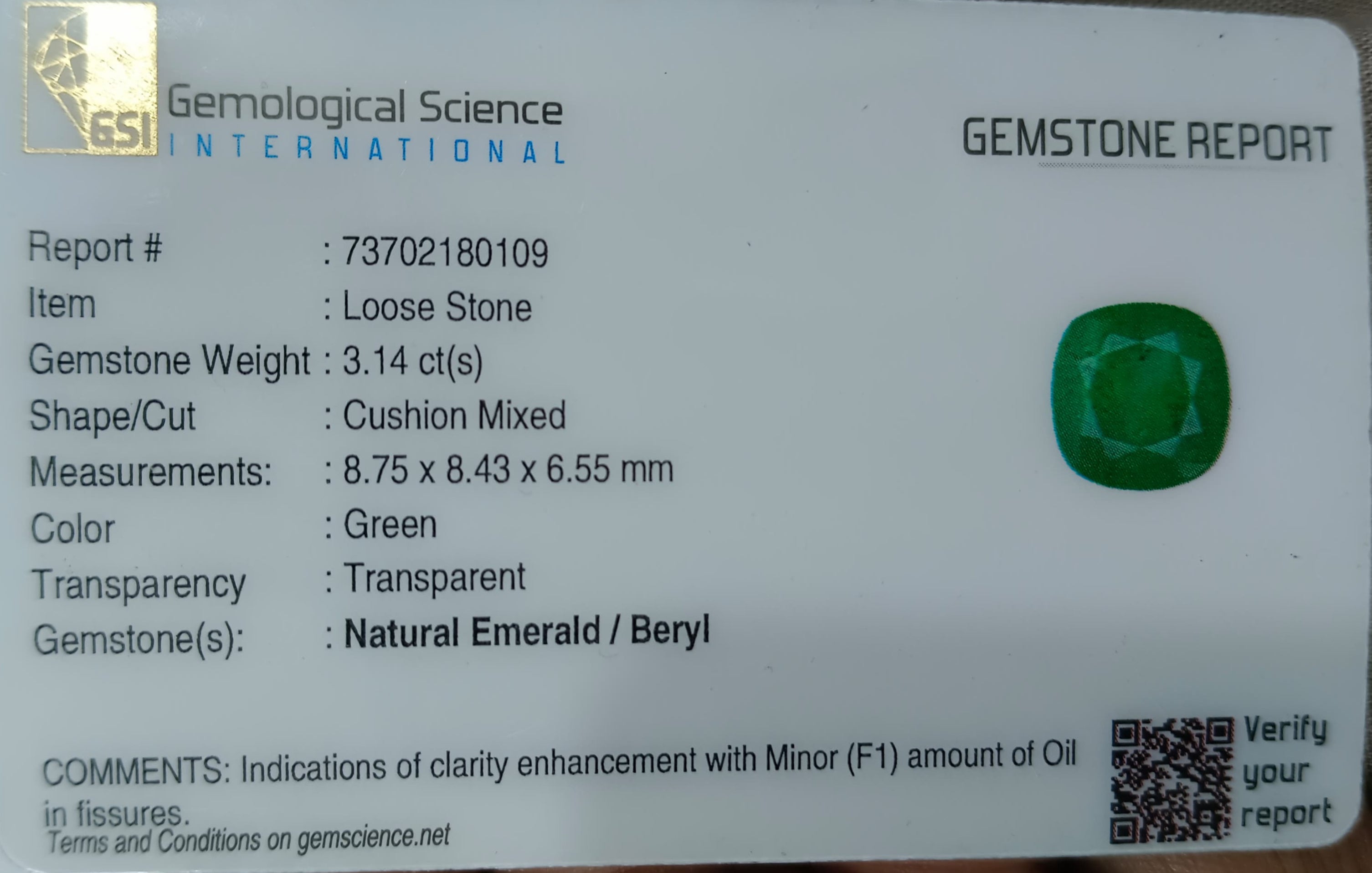 Colombian Emerald 3.14ct Deep Pure Velvet Green Natural Certified Cushion Cut Gemstone