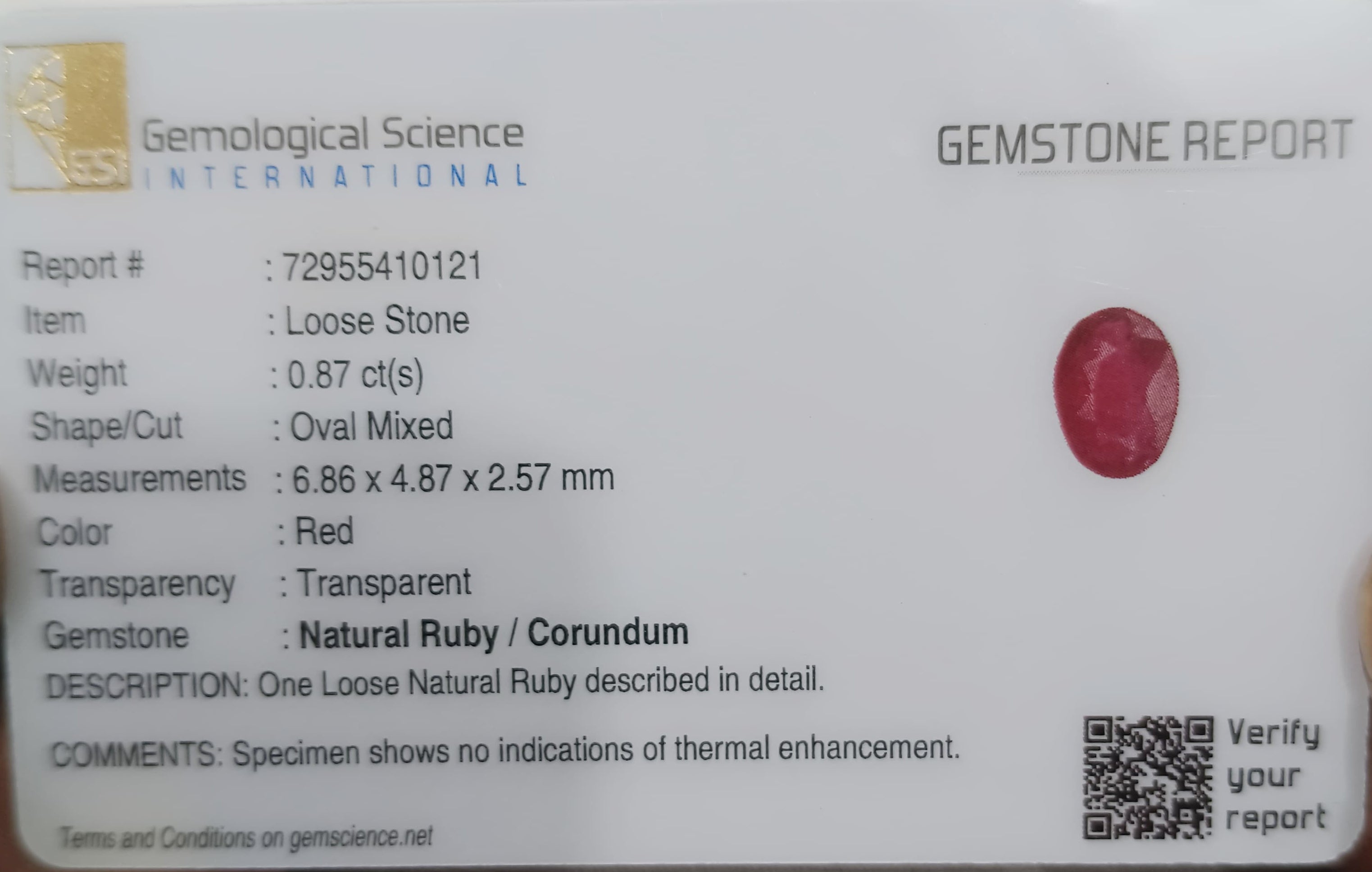 GSI certified 0.87ct untreated Mozambique ruby +Natural Untreated ruby+Clarity - Transparent / Moderately included+Color - Red+Lustre - good+Cut - Good...