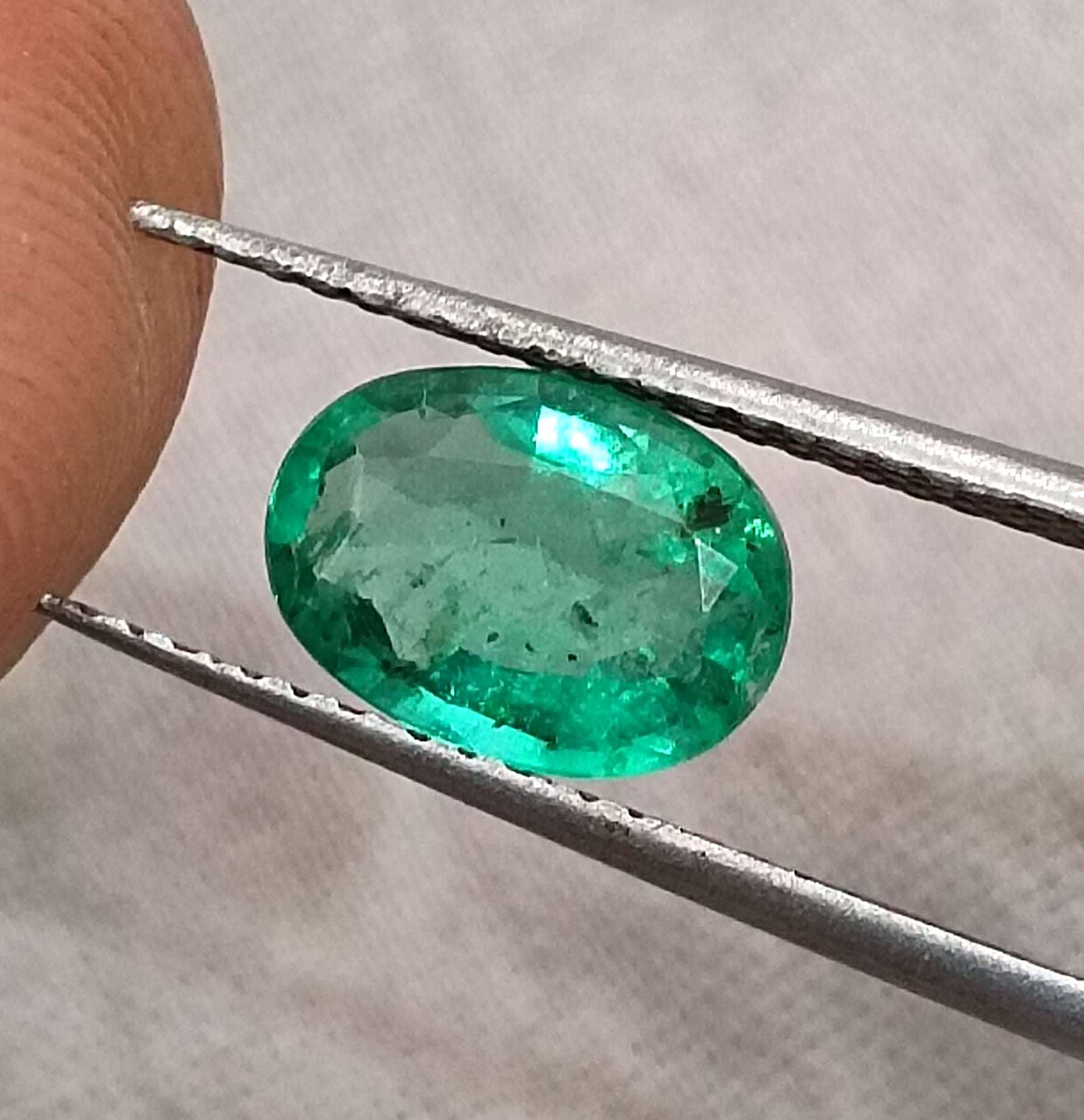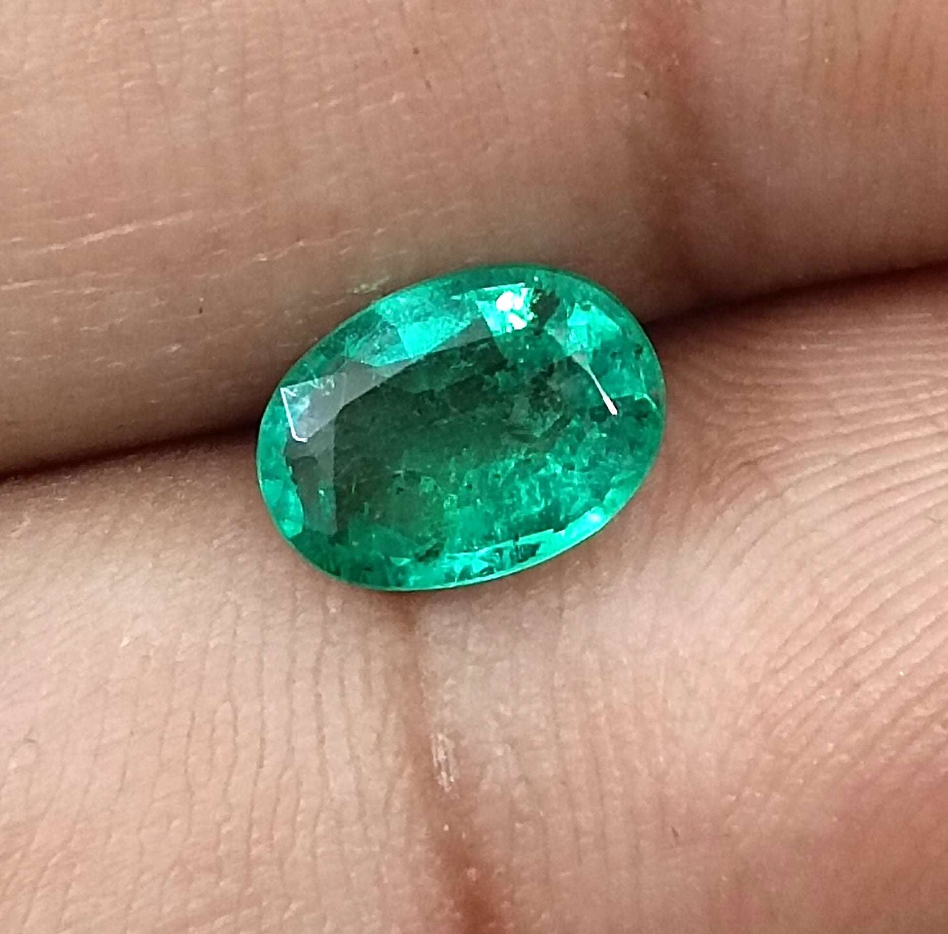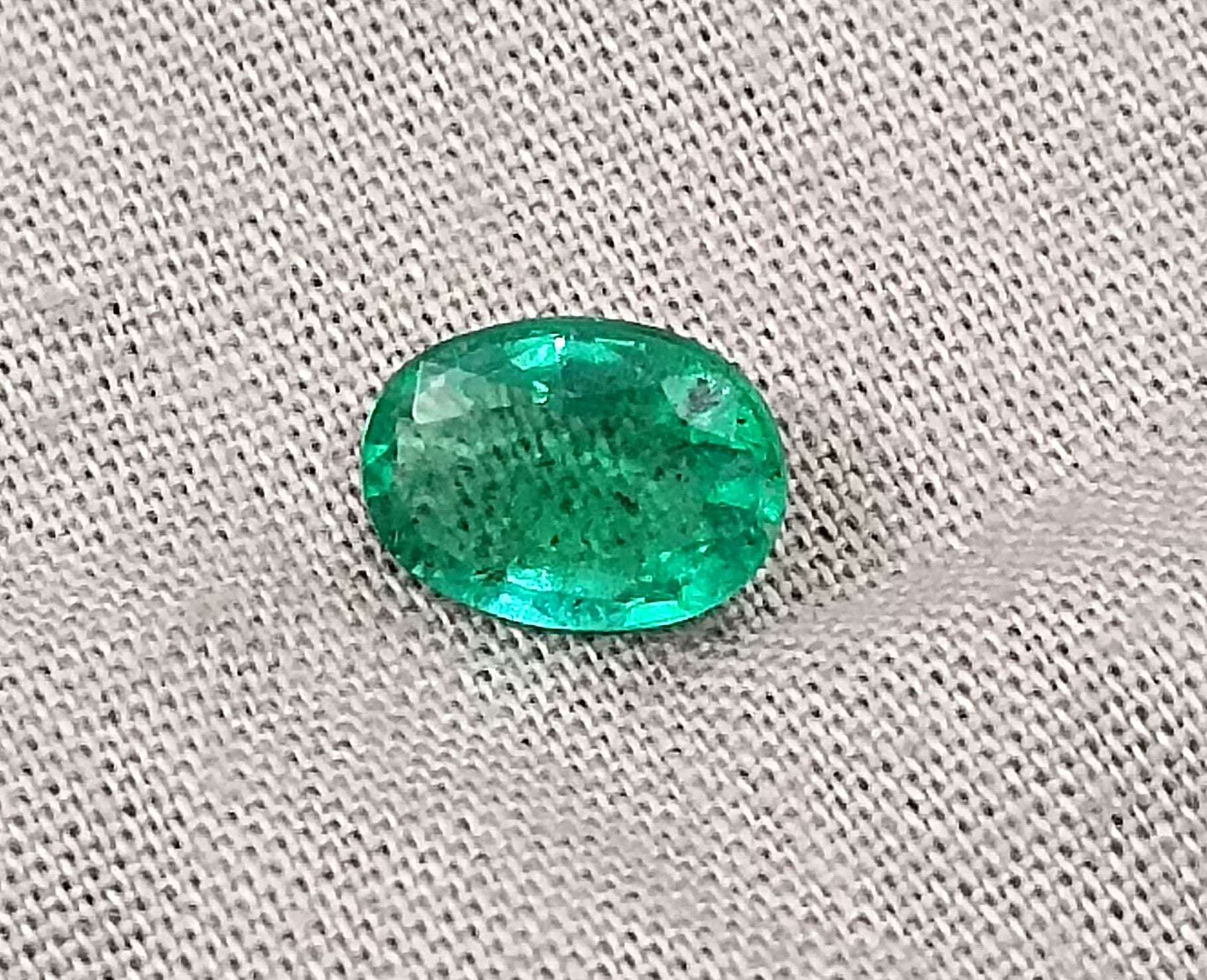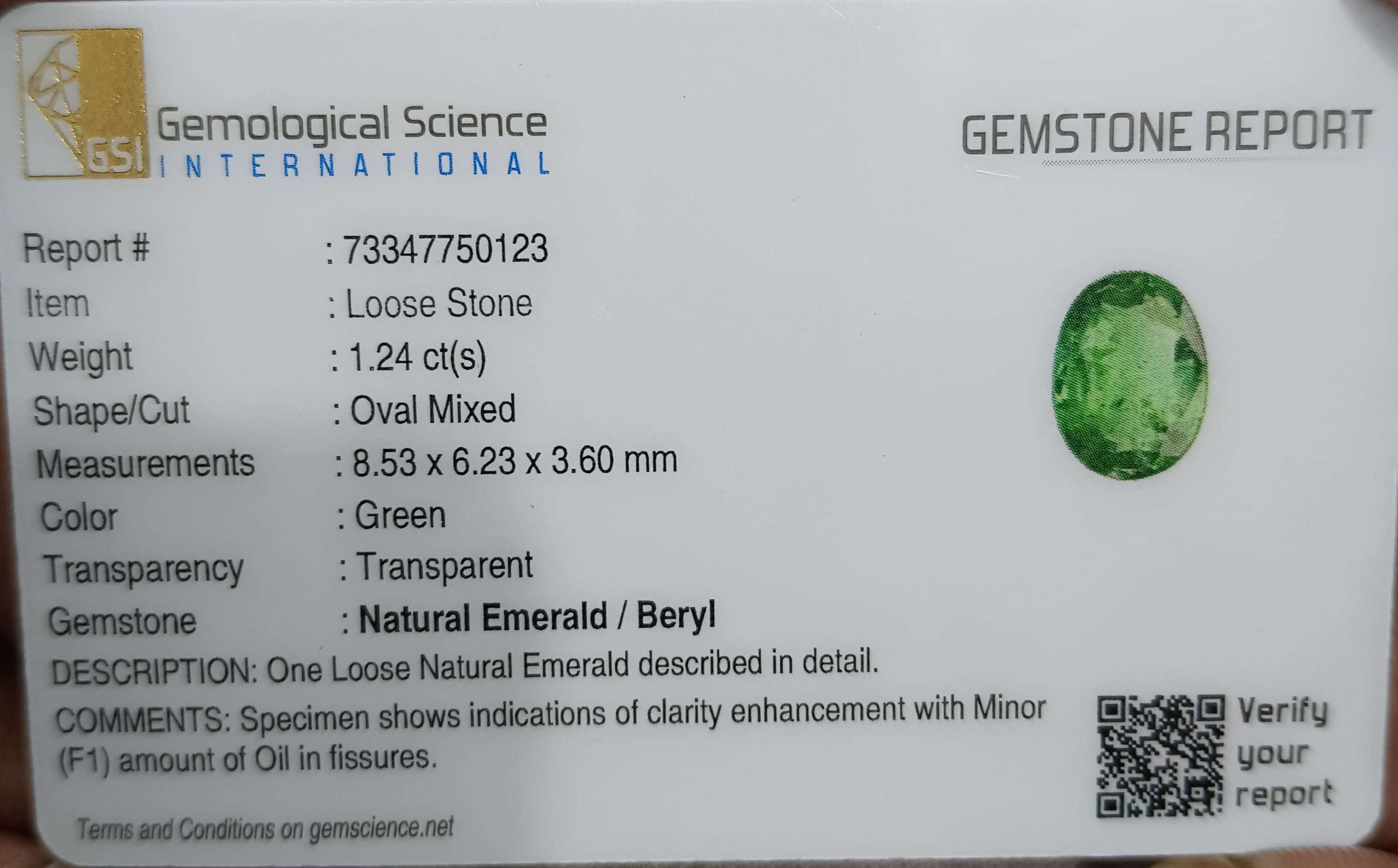 1.24 carats GSI certified Vivid medium green Zambian emerald. Oval cut minor oiled loose gemstone. Color: Vivid medium green...