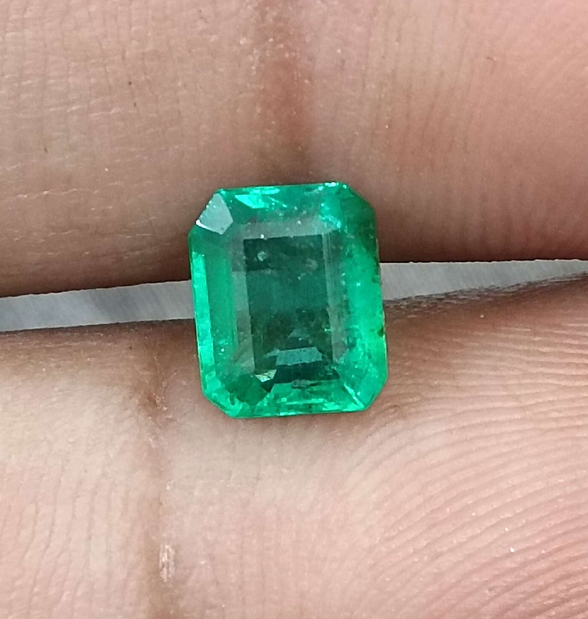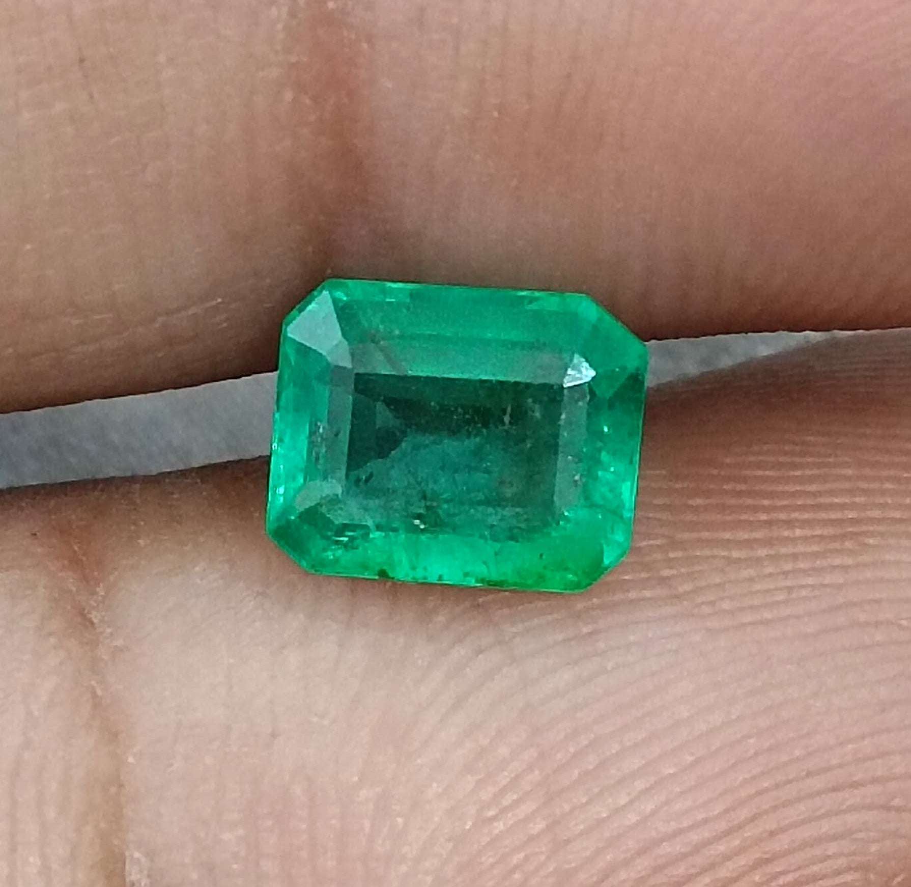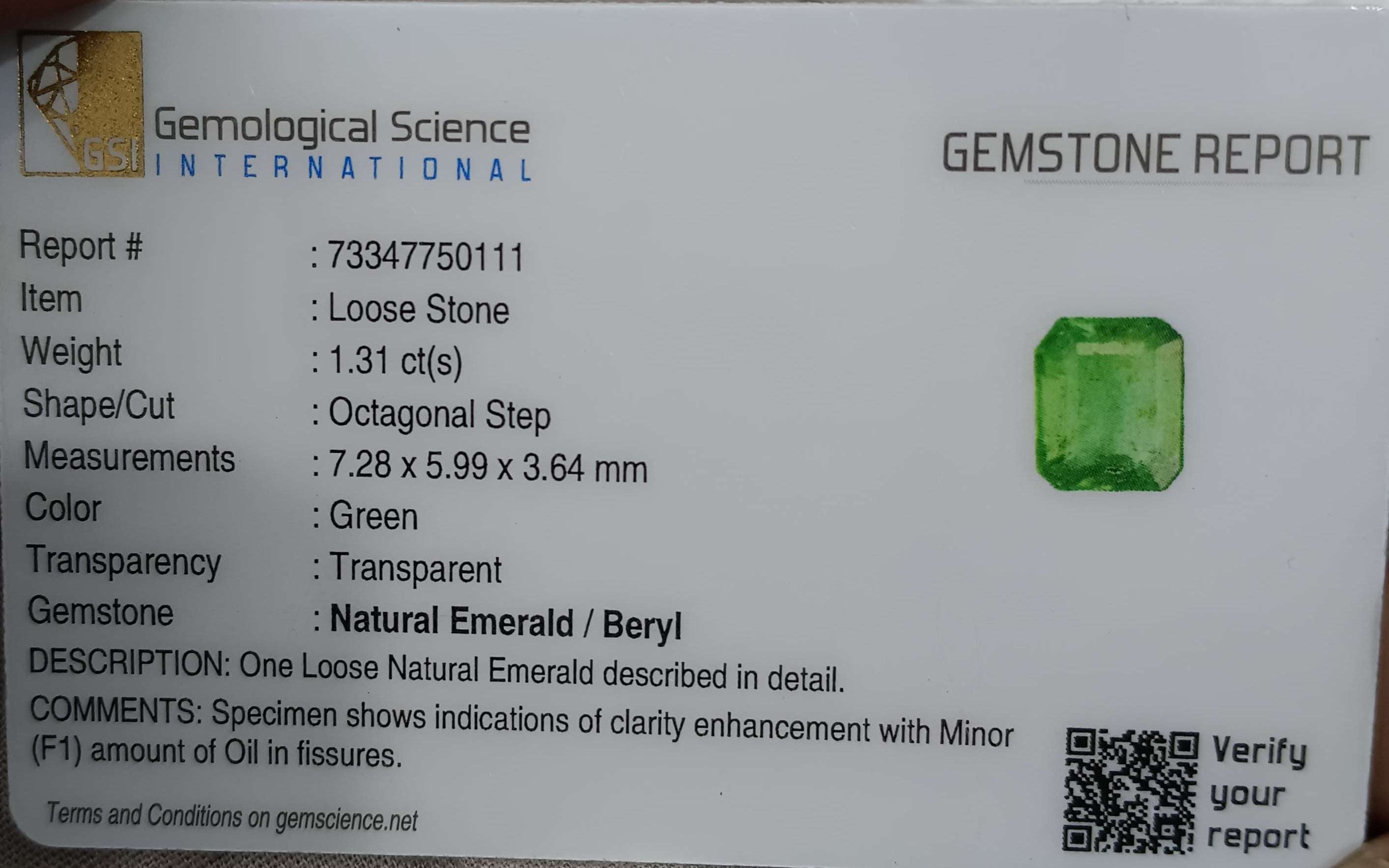 Quality 1.31 carats GSI certified parrot green Zambian emerald. Emerald cut Minor oiled loose gemstone. Color: Parrot green Cut...
