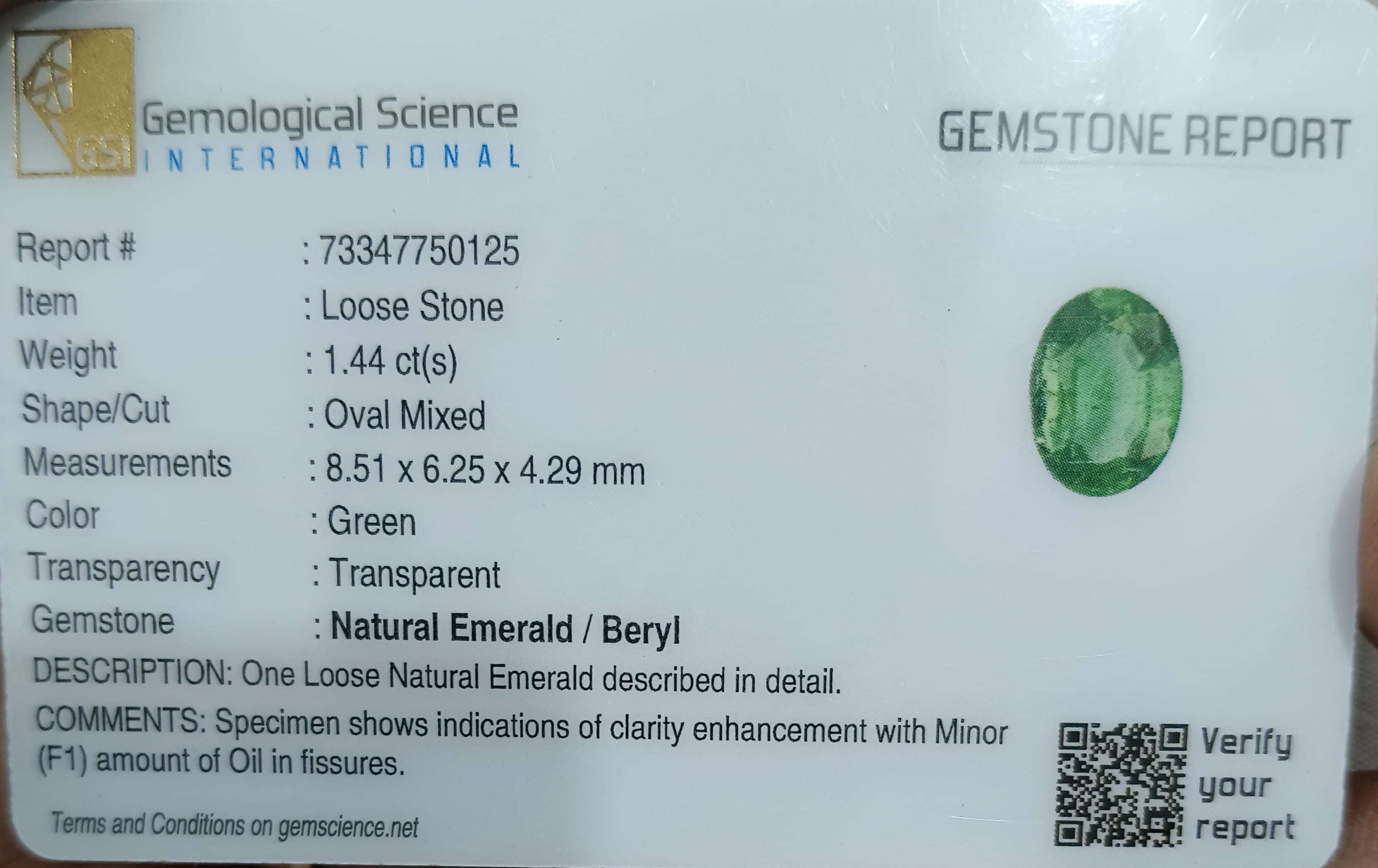 1.44 carats GSI certified medium shamrock green Zambian emerald. Minor oiled loose gemstone. Color: Medium shamrock green Cut -...