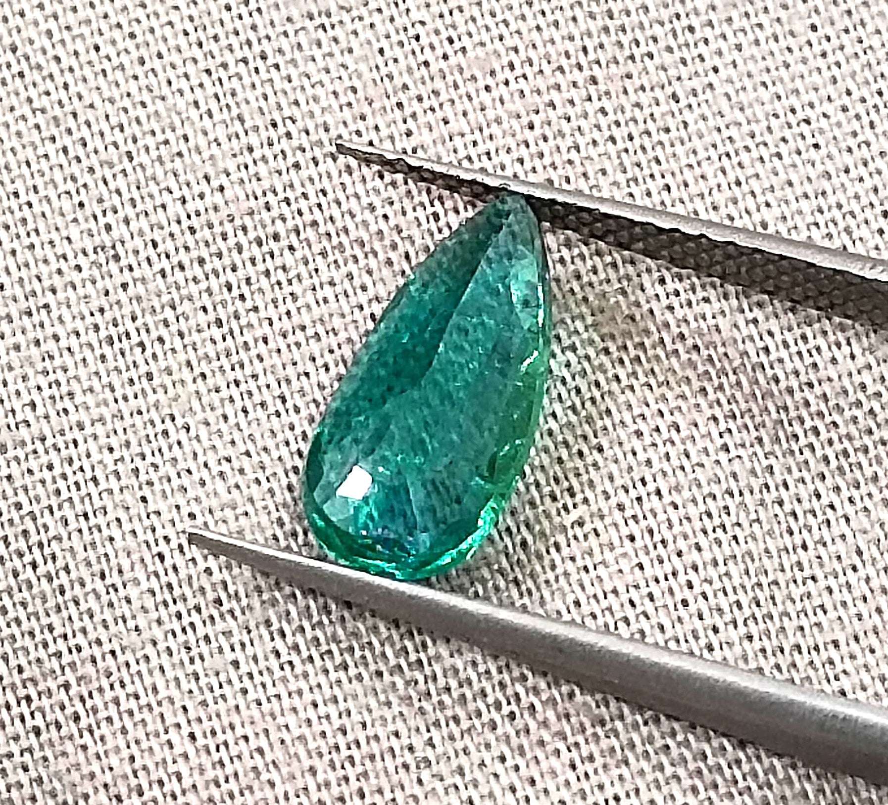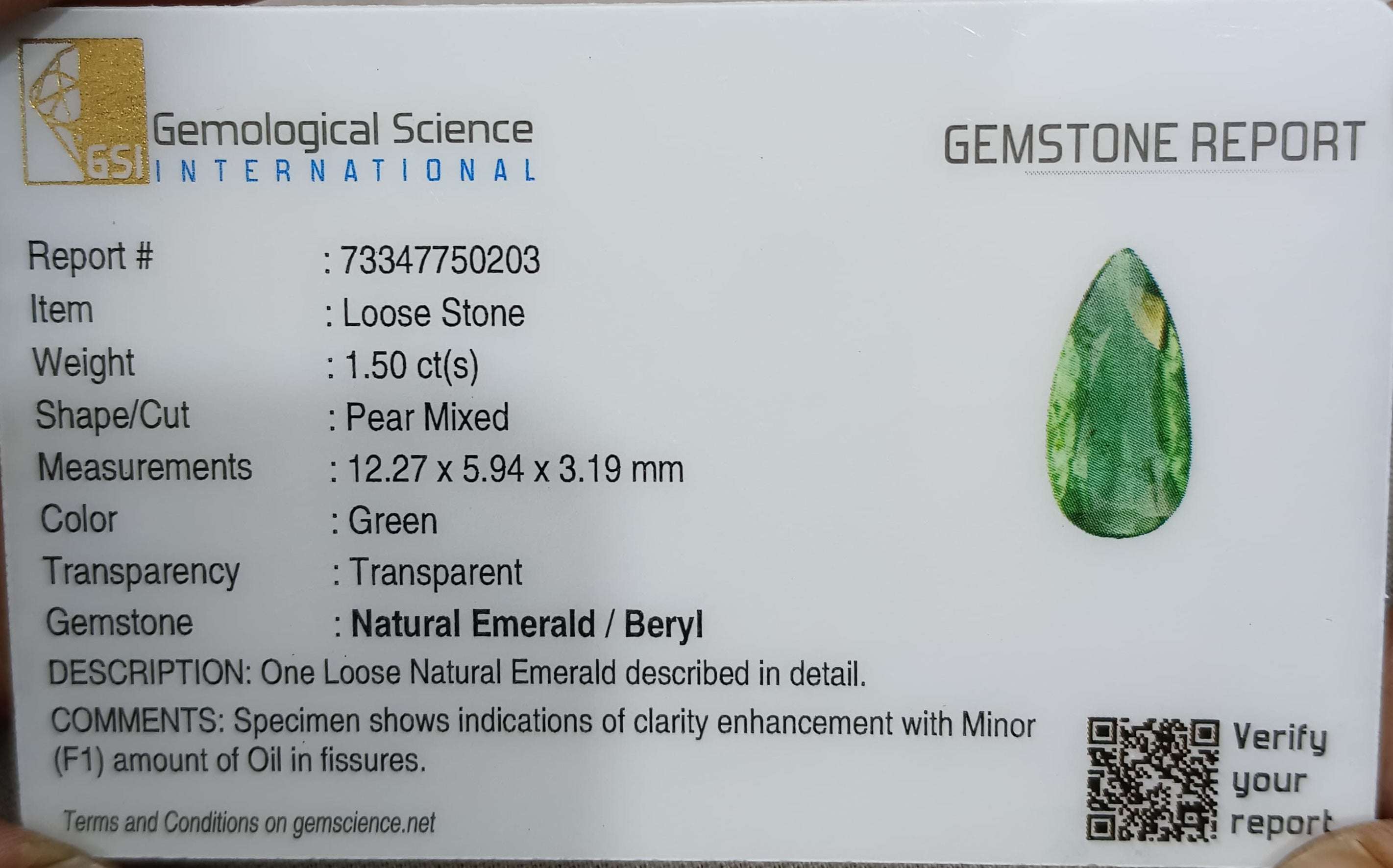 1.50 carats GSI certified medium deep green Zambian emerald. Minor oiled loose gemstone. Color: medium deep green Cut -...