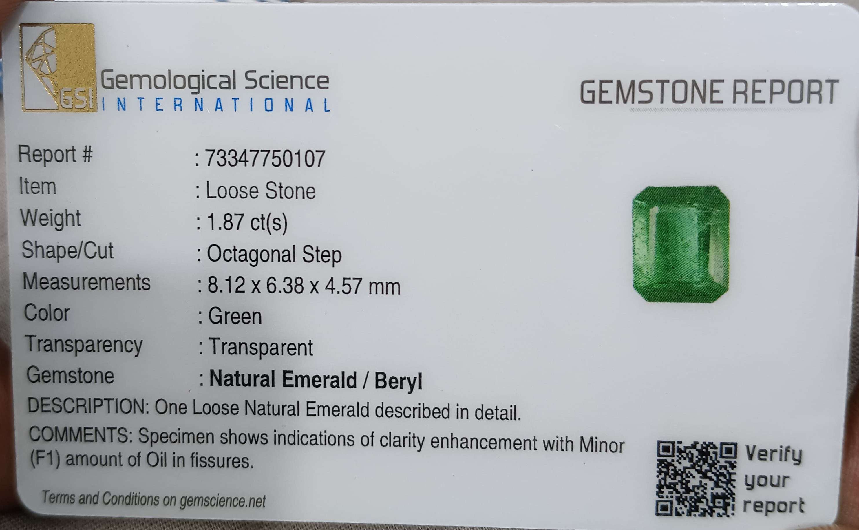 1.87 carats GSI certified medium deep metal green Zambian emerald. Minor oiled loose gemstone. Color: Medium deep metal green...