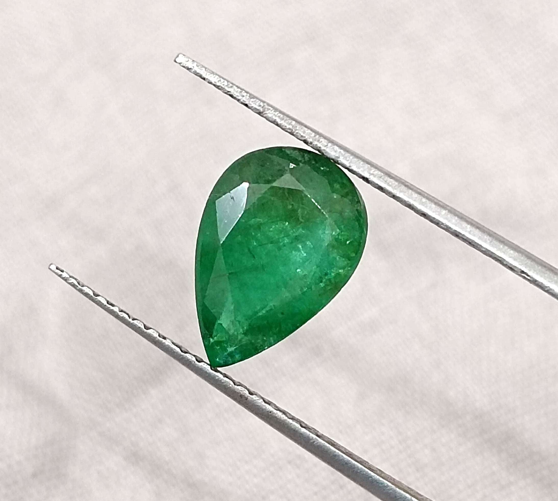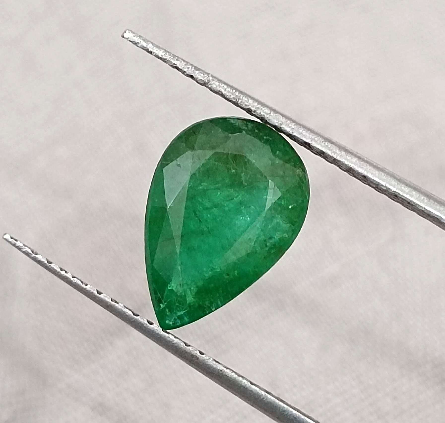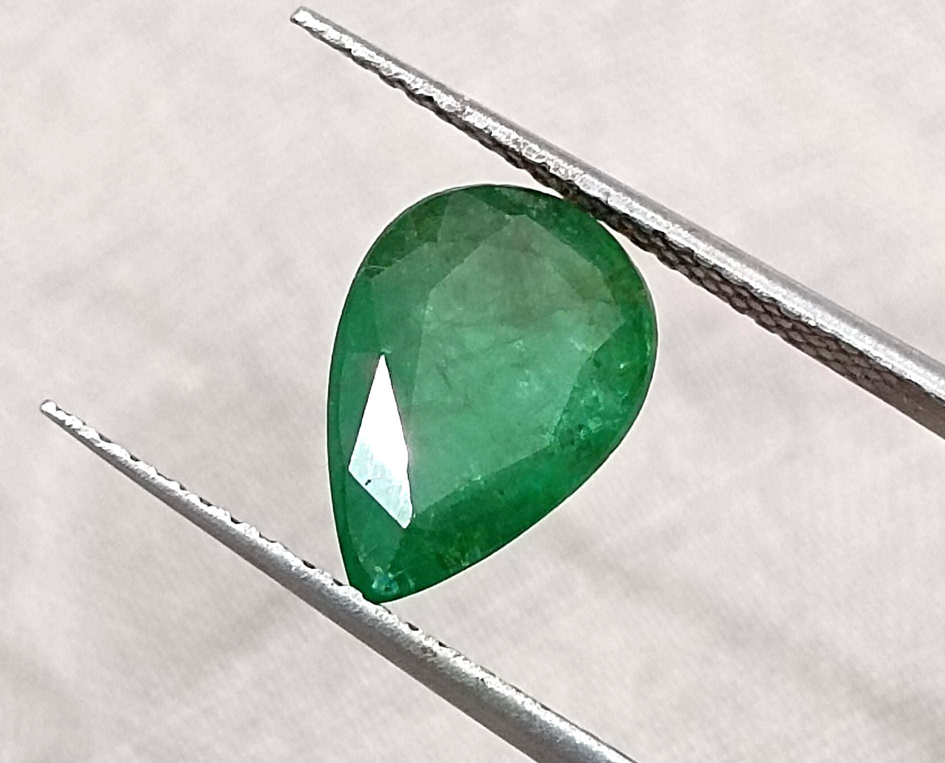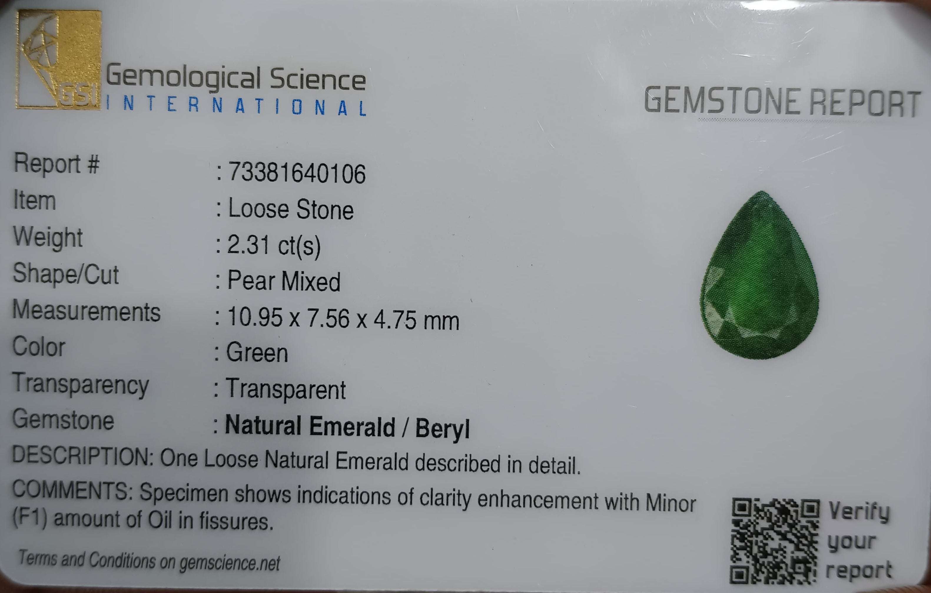2.31 carats GSI certified Deep green natural Zambian emerald. Minor oiled loose gemstone.Color: Deep GreenCut - Pear cut Lustre -Very Good...