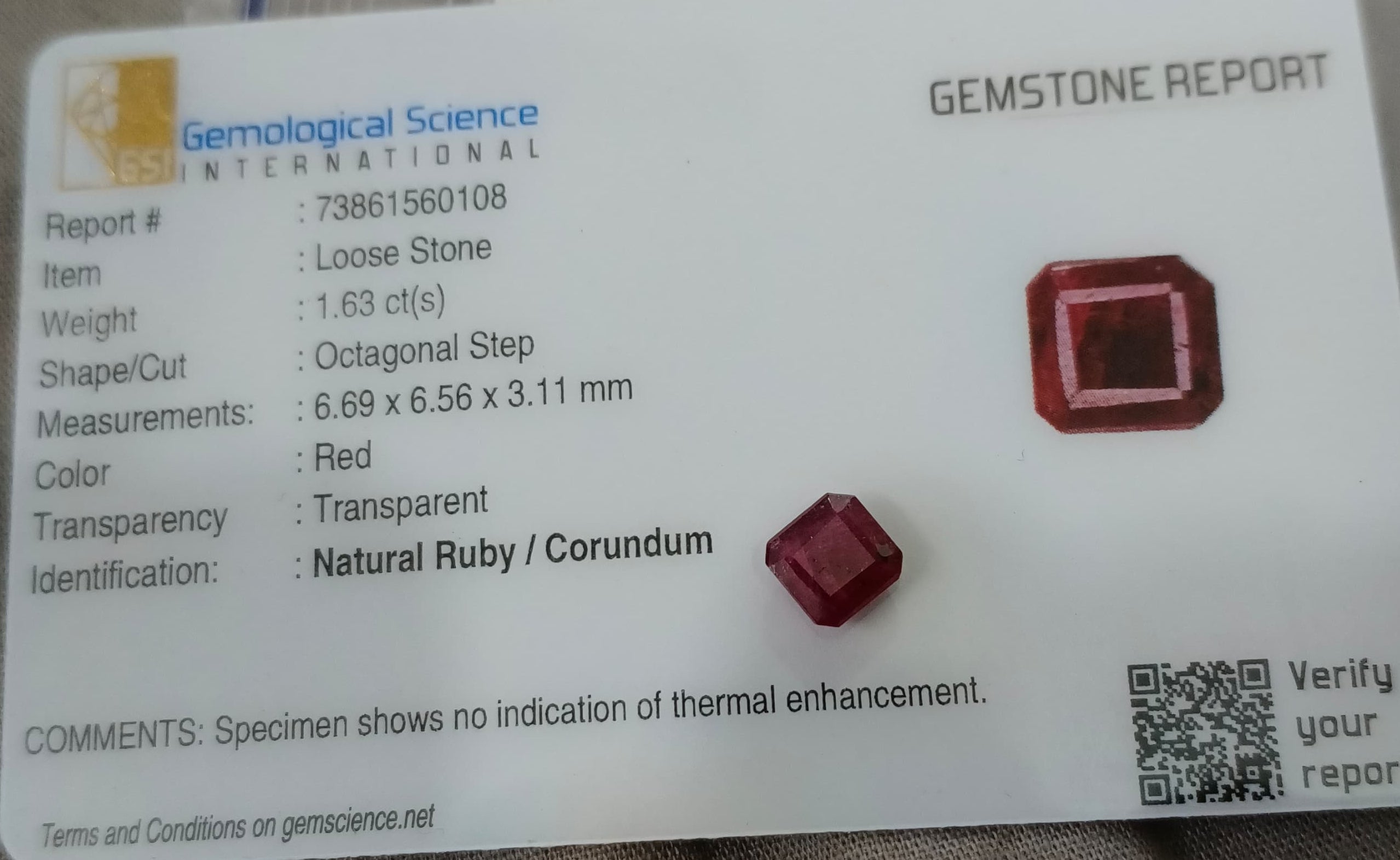 Mozambique Ruby 1.63ct Natural Certified Unheated Octagon Cut Gemstone