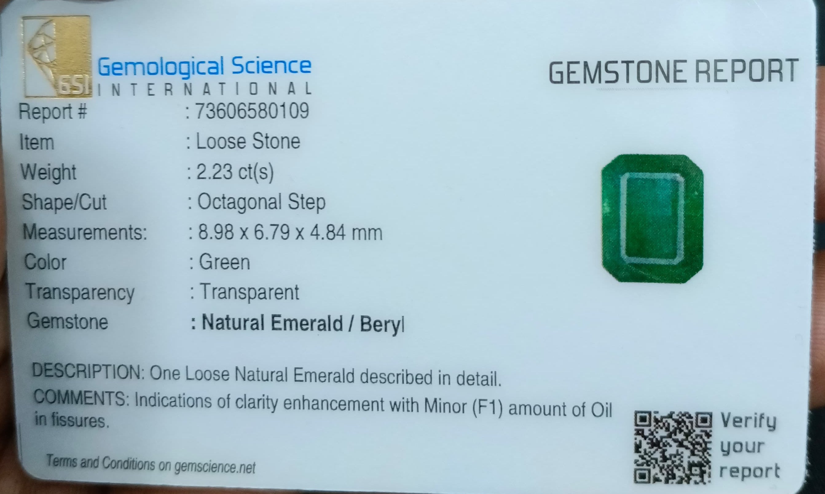 2.23 carats GSI certified medium deep green Zambian emerald. Octagon cut loose gemstone. Color: Medium deep green Cut - Emerald...