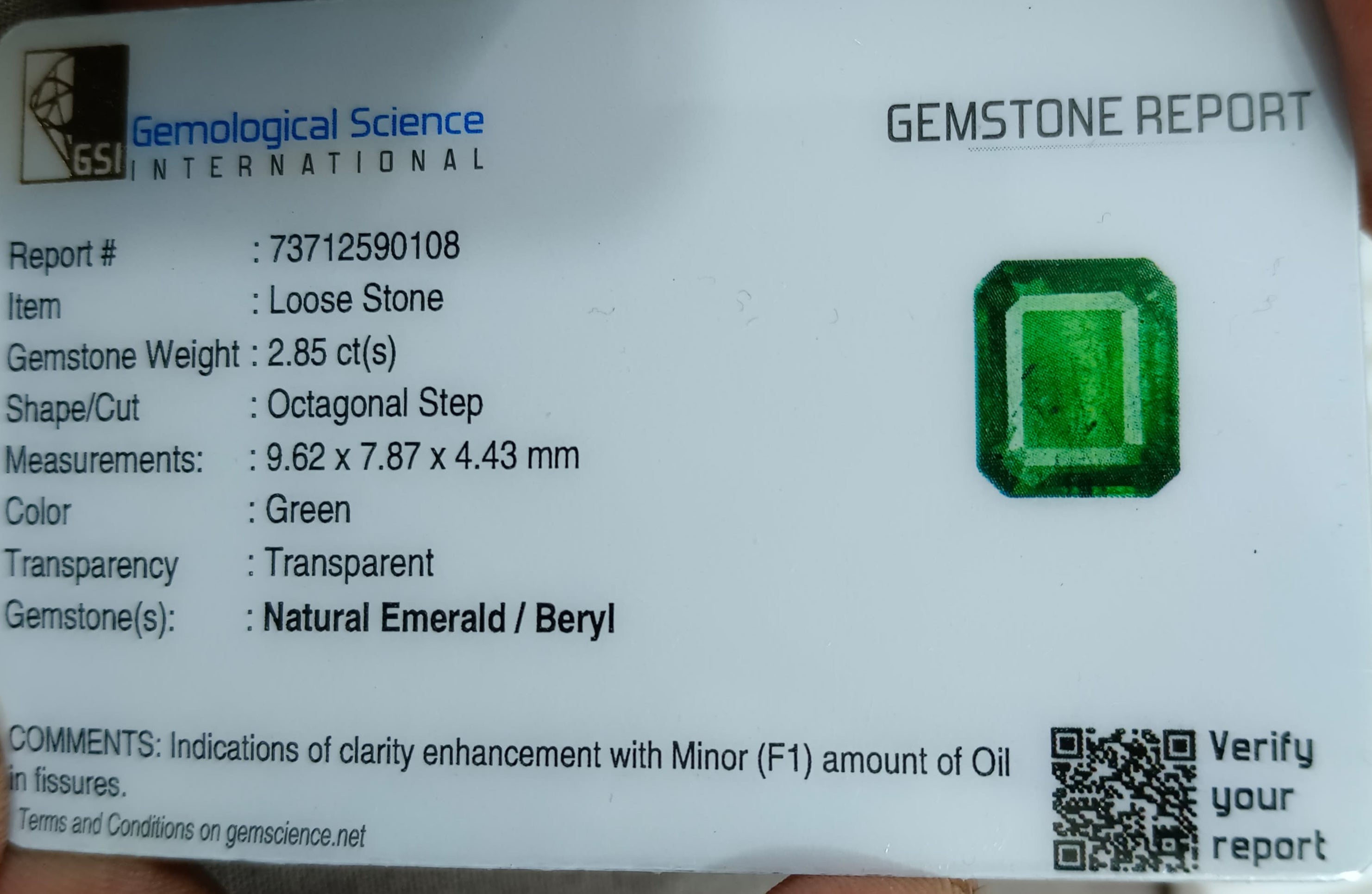 2.85 carats GSI certified deep forest green Zambian emerald. Minor oiled loose gemstone. Color: Deep forest green Cut -...