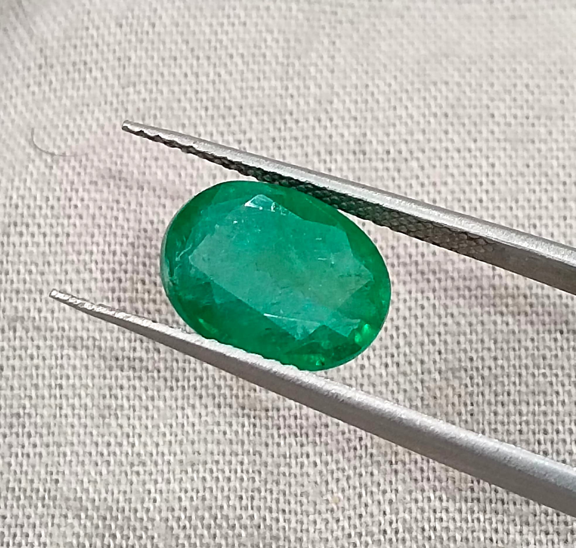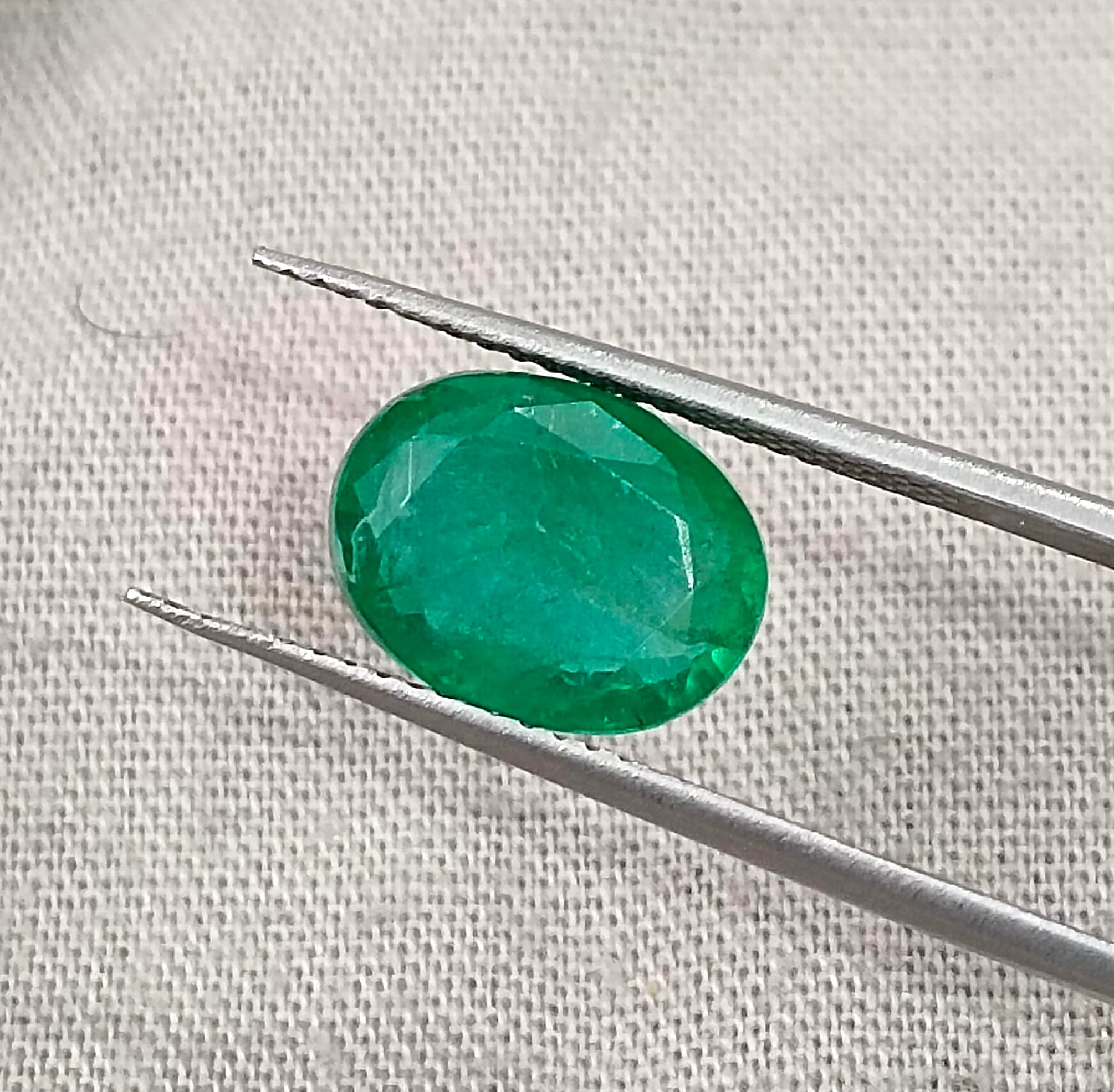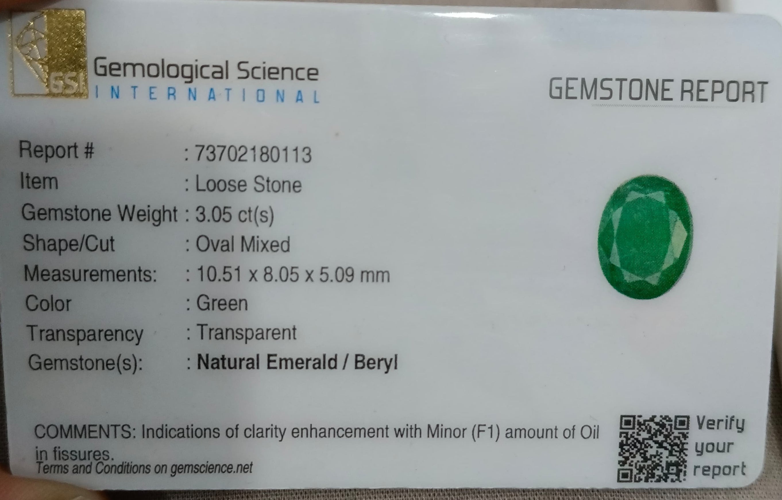 3.05 carats GSI certified medium deep green Zambian emerald. Color: Medium deep green, proper color saturation. Cut - Oval...