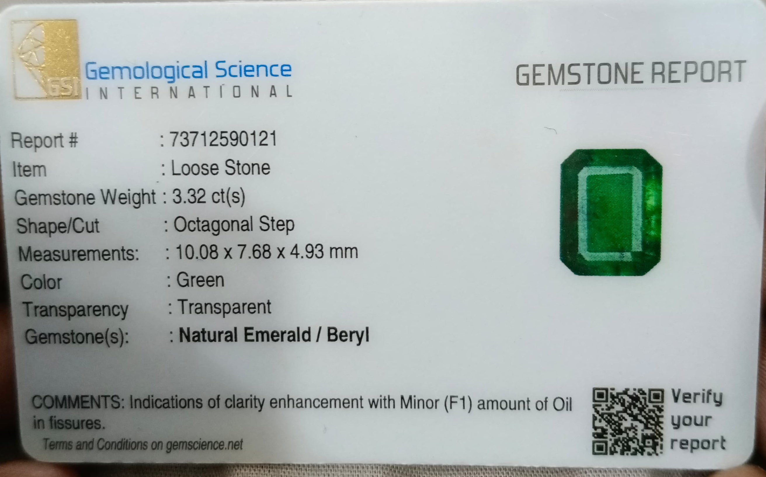3.32 carats GSI certified medium deep green Zambian emerald. Color: Medium deep green Cut - Octagon cut Lustre - Excellent...