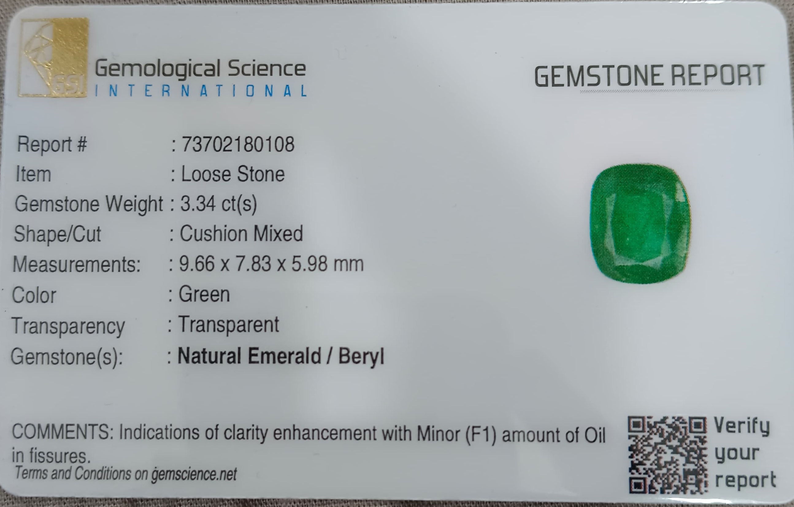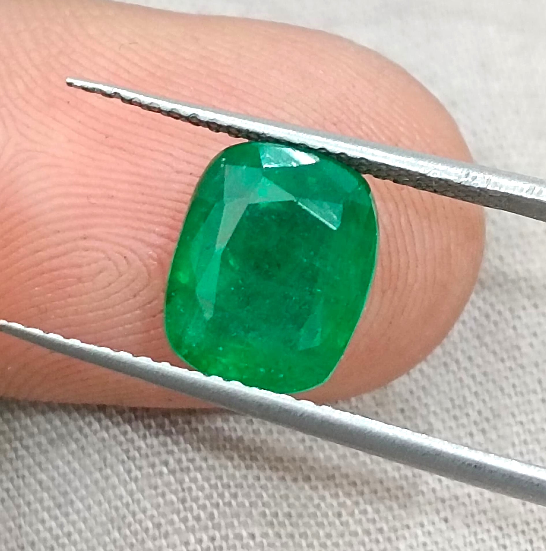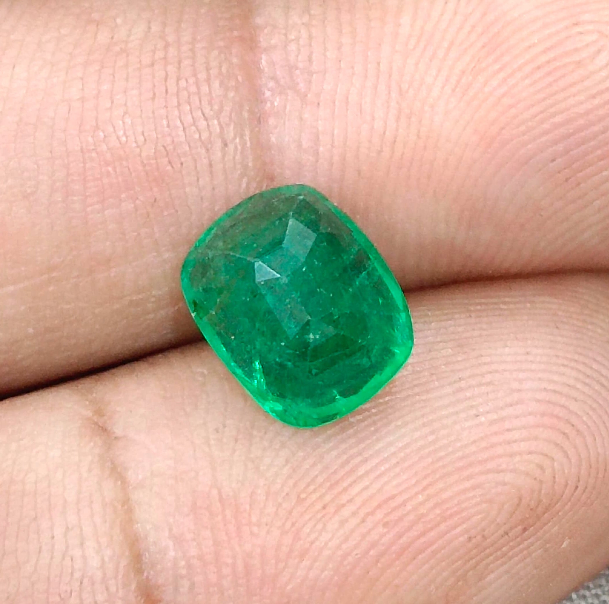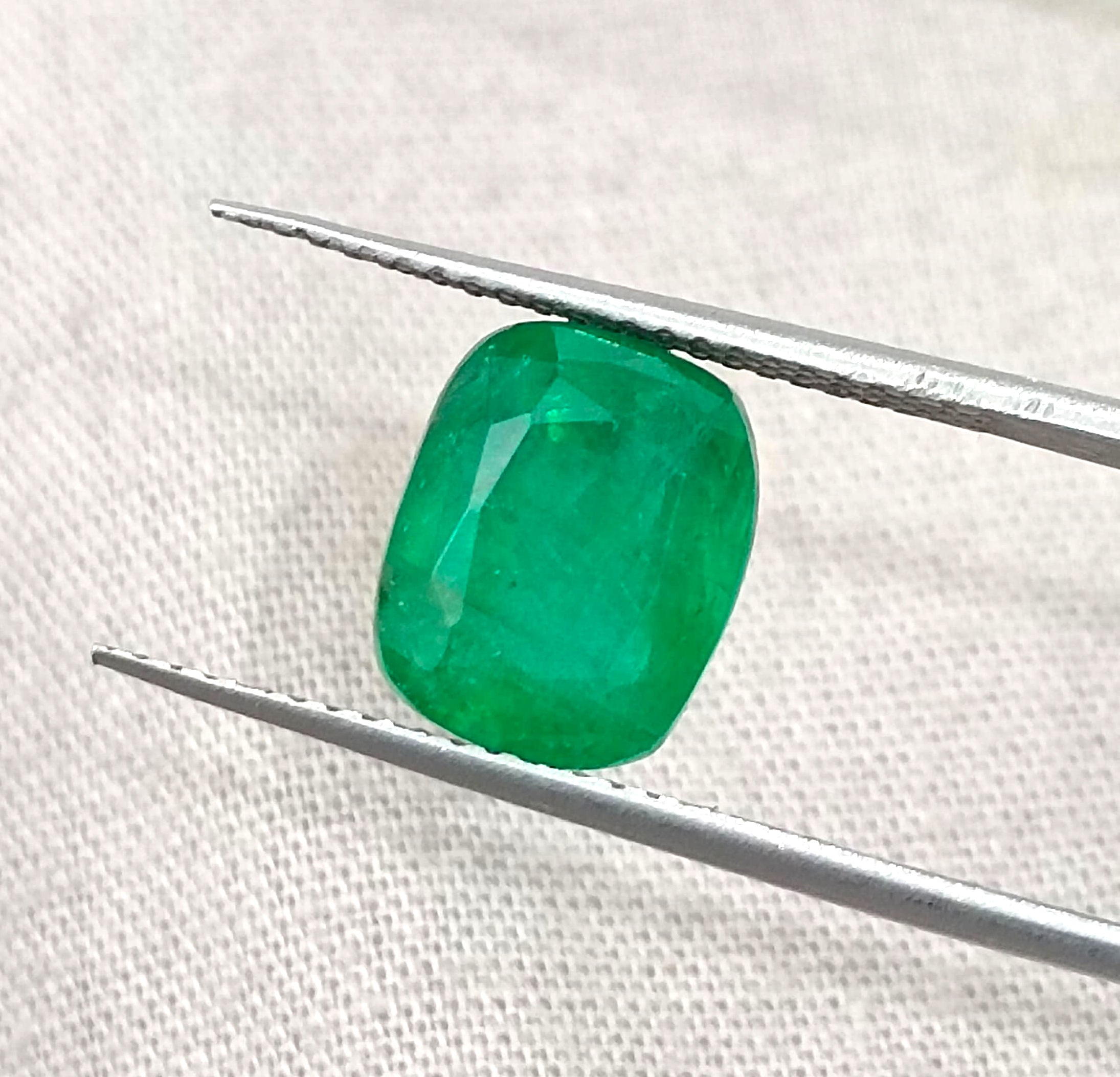 3.34 carats GSI certified vivid green Zambian emerald. Color: Vivid medium deep green Cut - Cushion cut Lustre -...