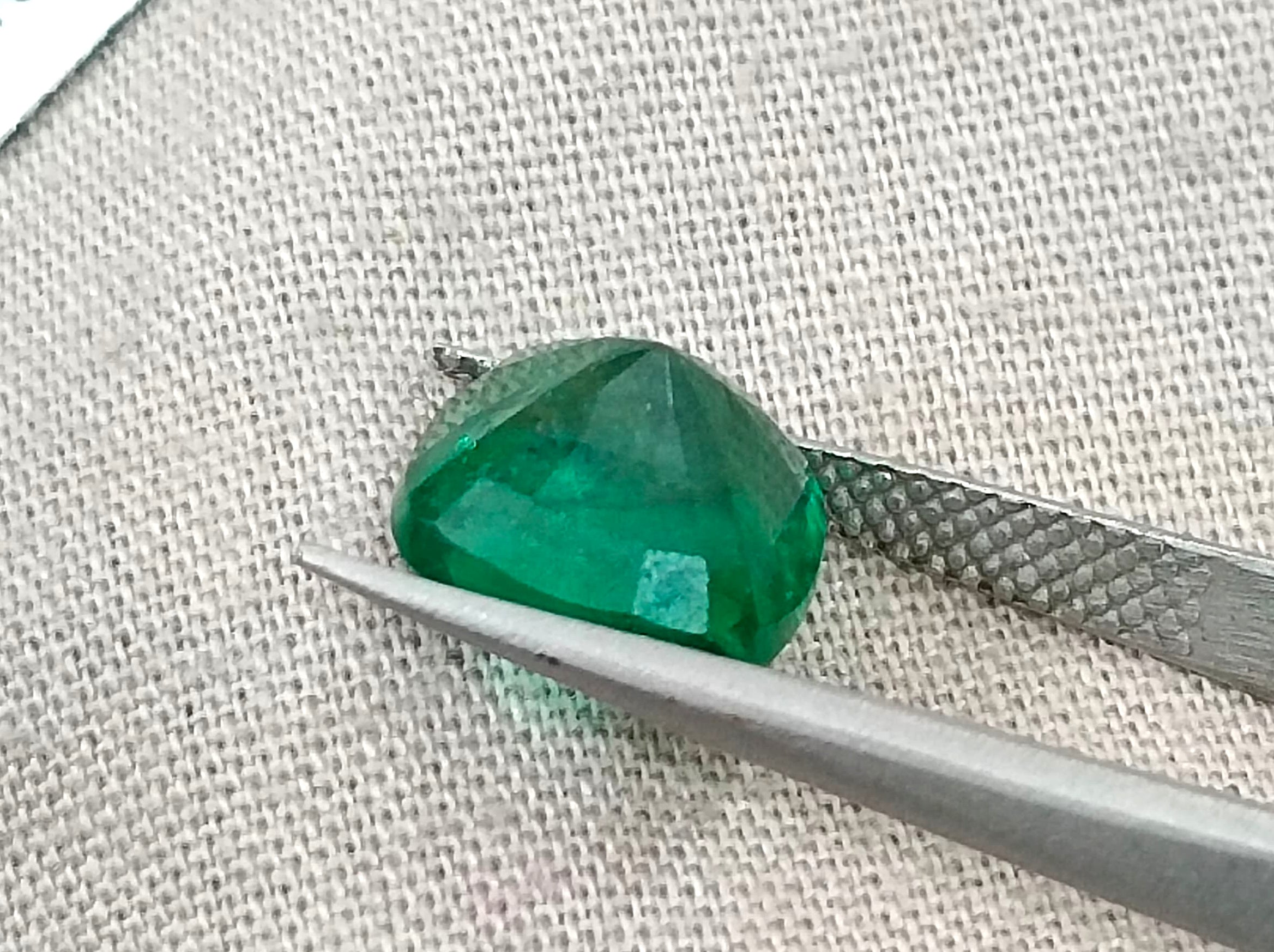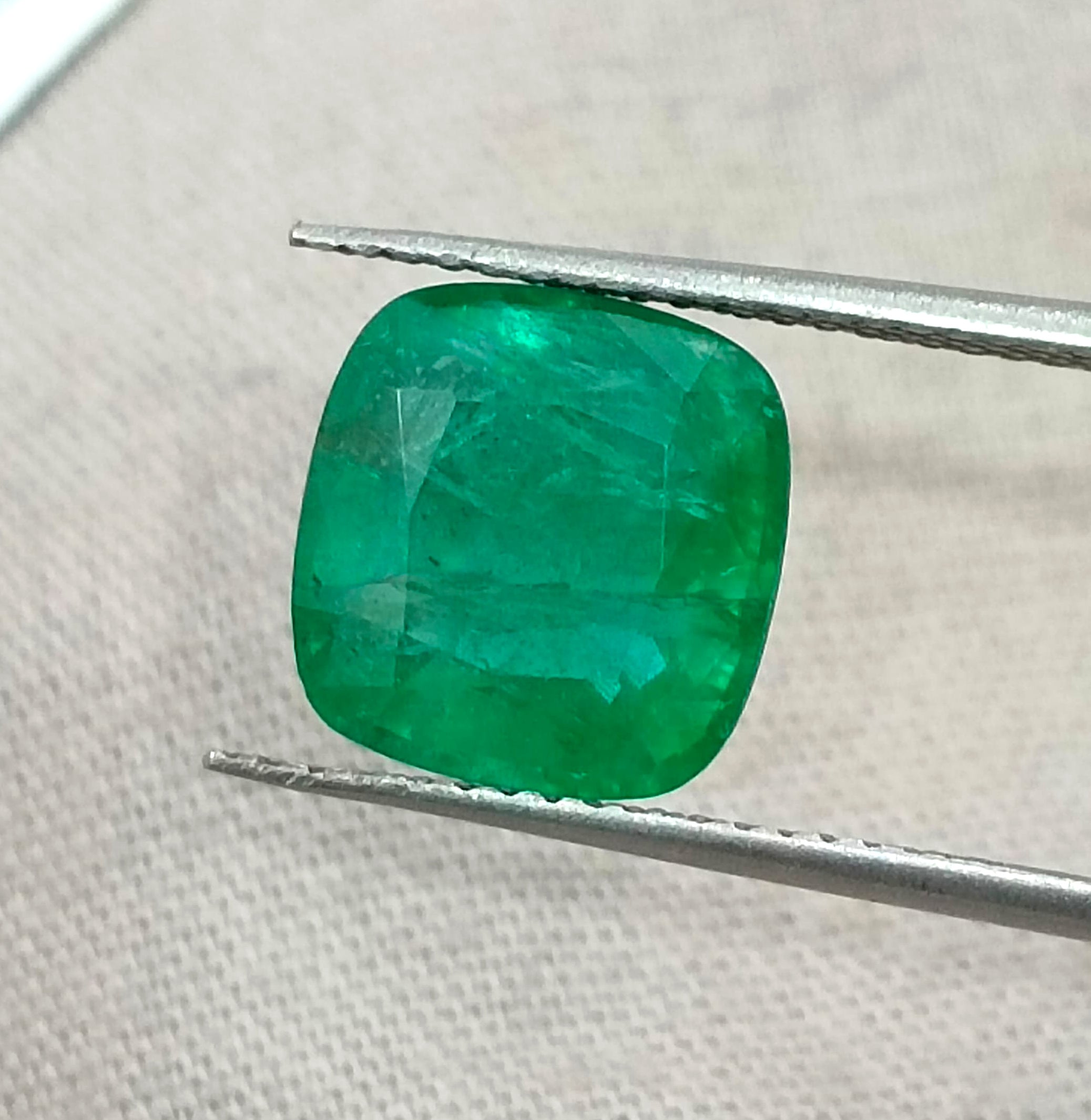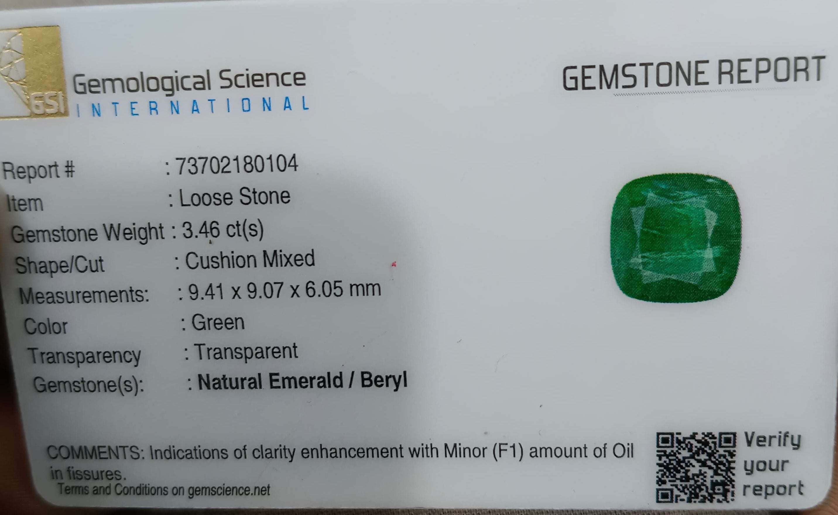 3.46 carats GSI certified vivid green Zambian emerald. Minor oiled loose gemstone. Color: Vivid green Cut - Cushion cut Lustre...