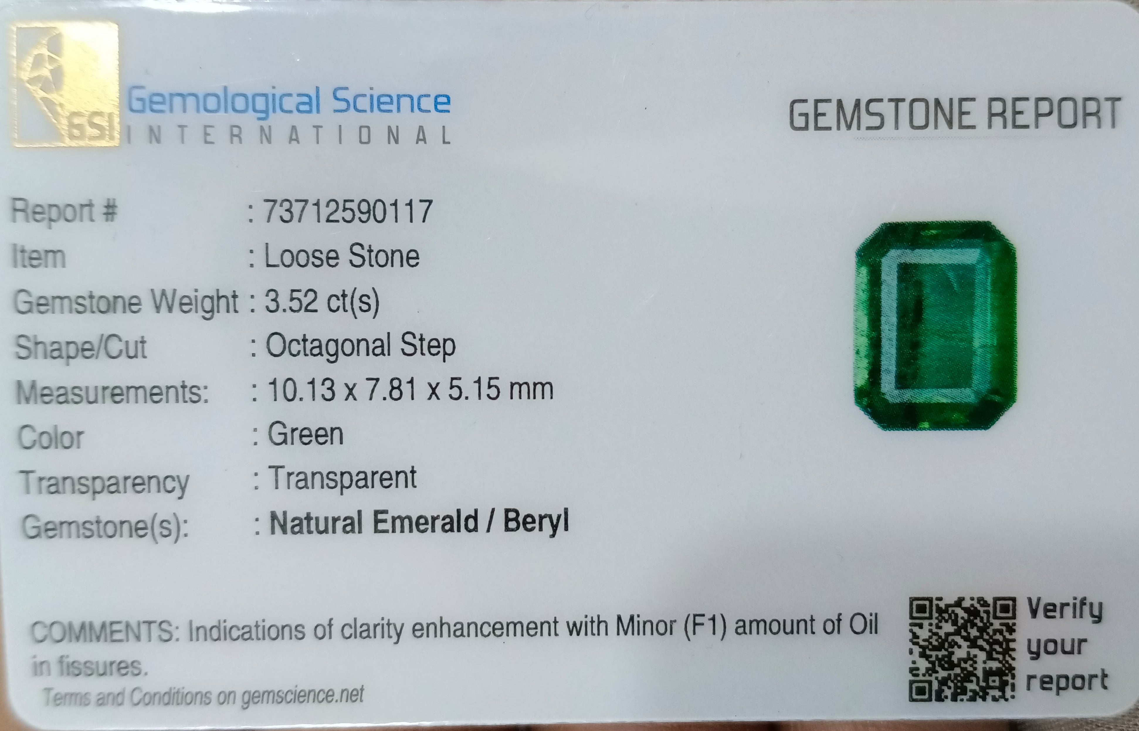 GSI certified 3.52ct bright metal green natural Zambian emerald. Color: Bright metal green.Cut -Emerald cutLustre - Very Good lustreOrigin: ZambiaClarity-...